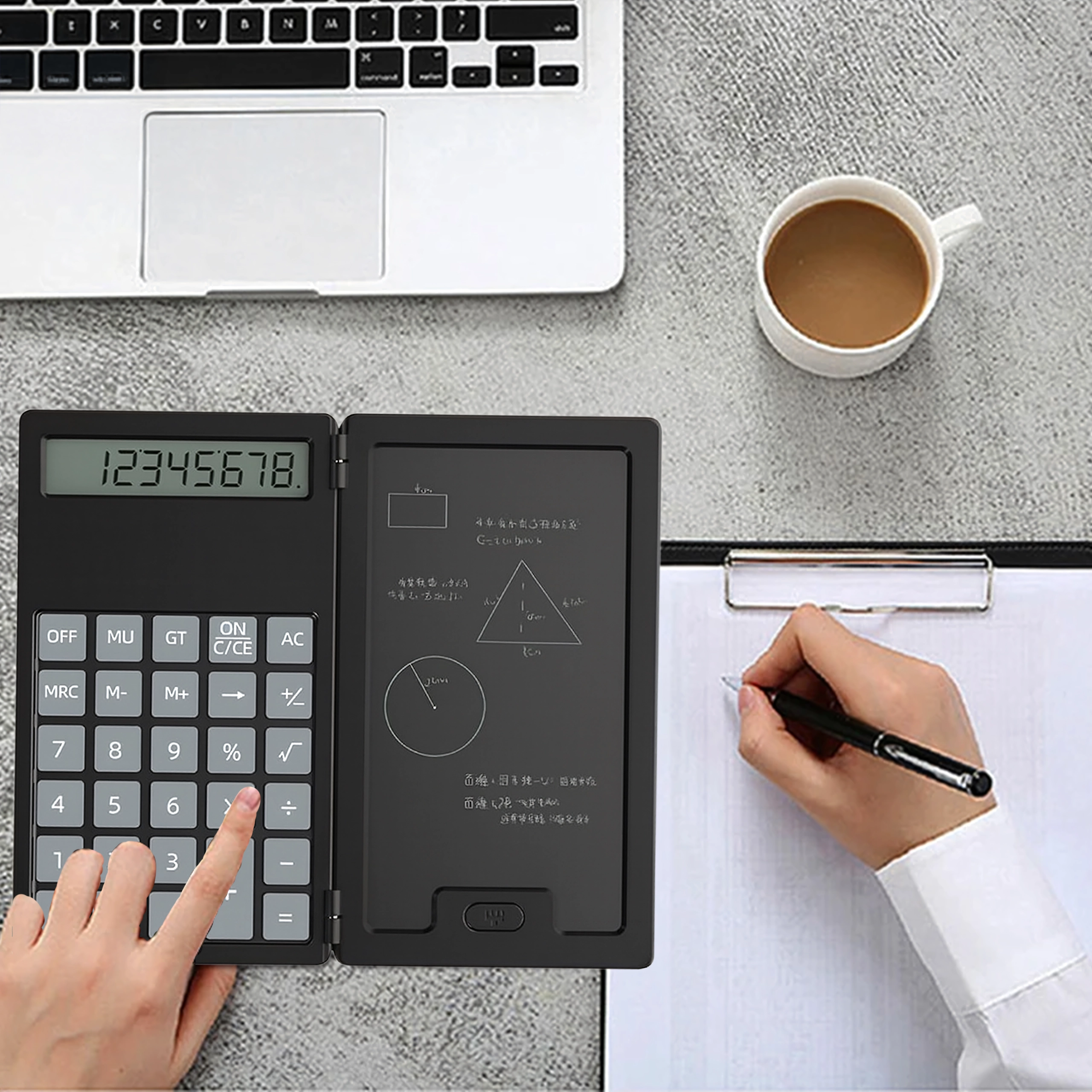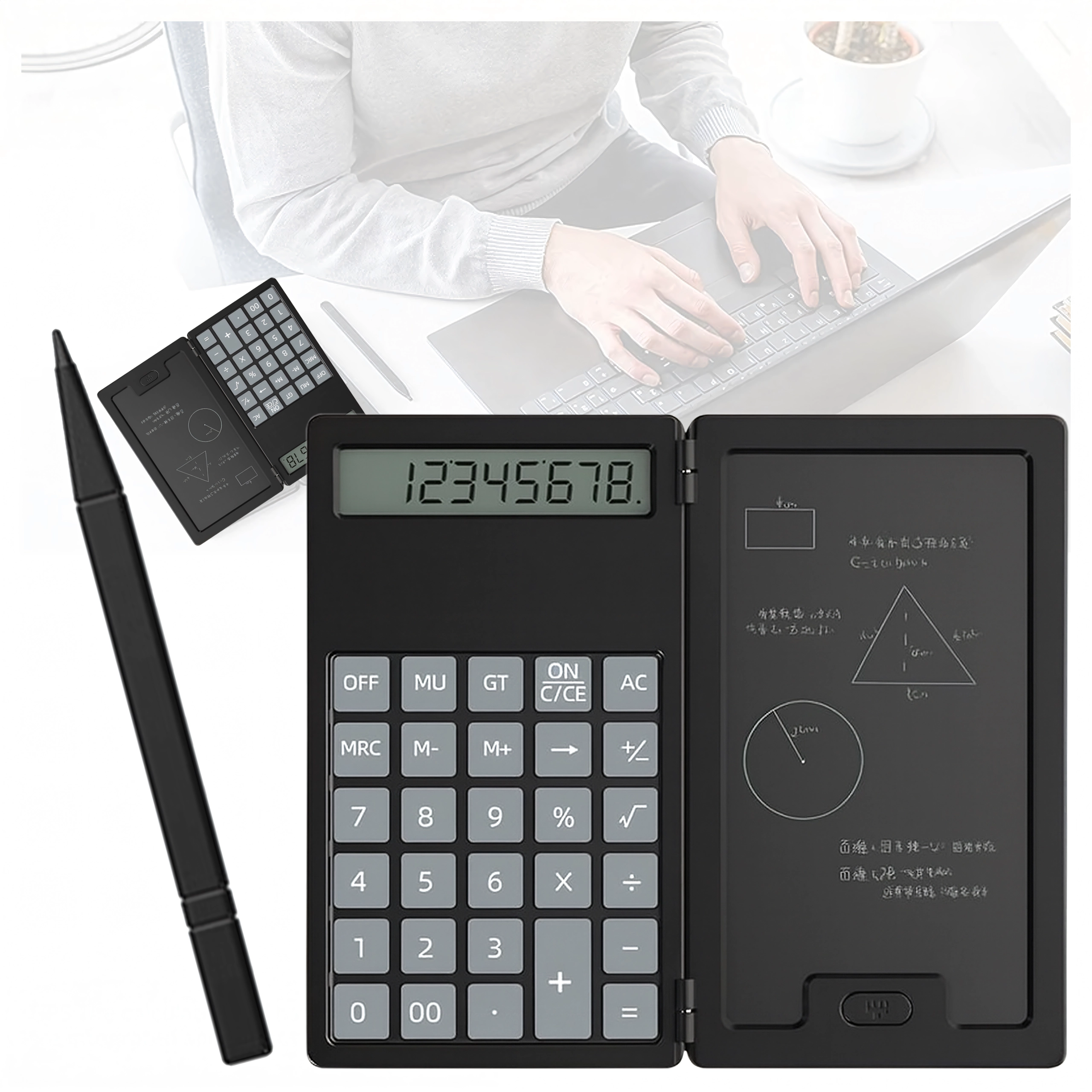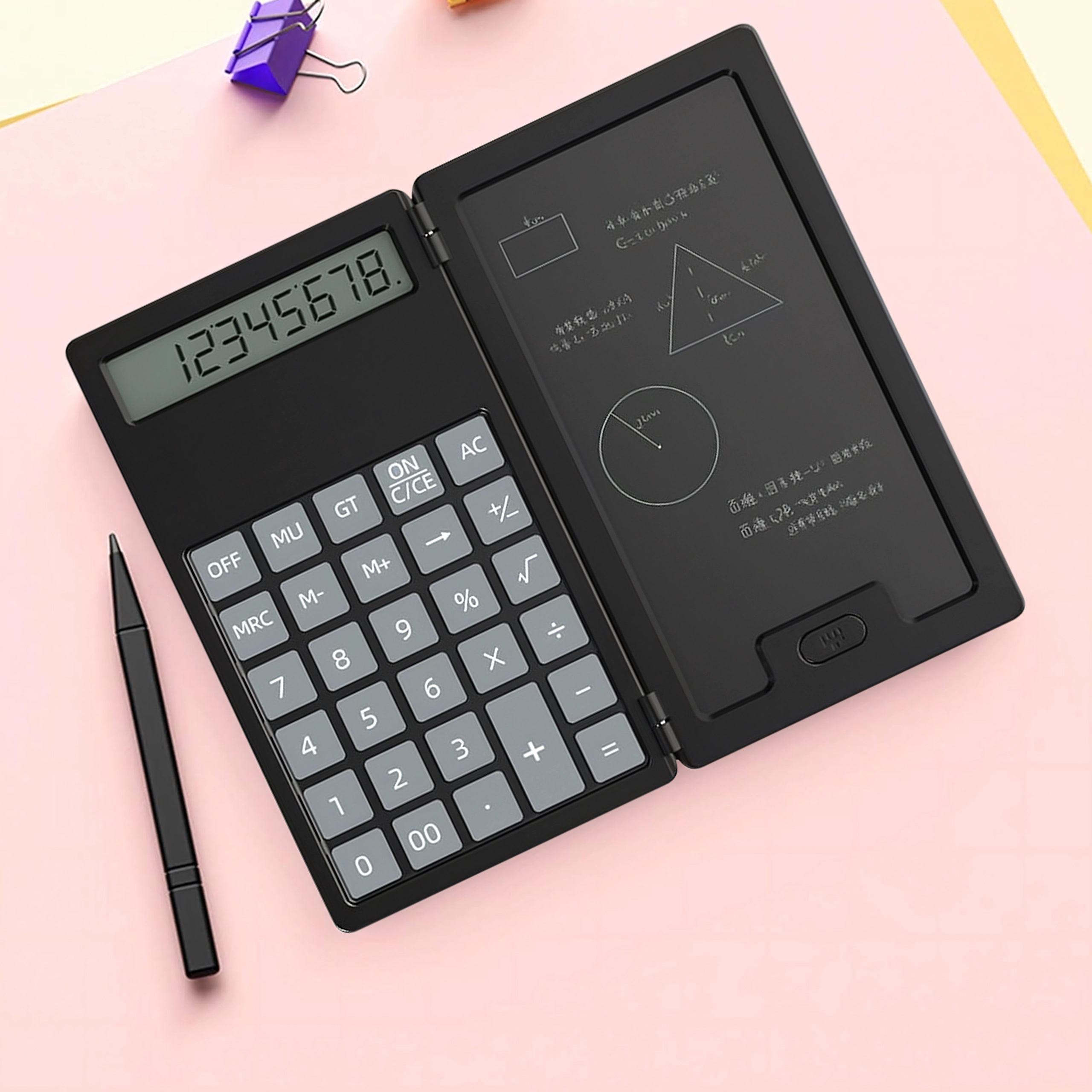 Questa smart calcolatrice con corpo pieghevole combina il calcolo classico con una pratica lavagnetta LCD per appunti. Grazie al design leggero e sottile, entra facilmente in borsa o in tasca e rimane sempre a portata di mano per calcoli e note veloci.
