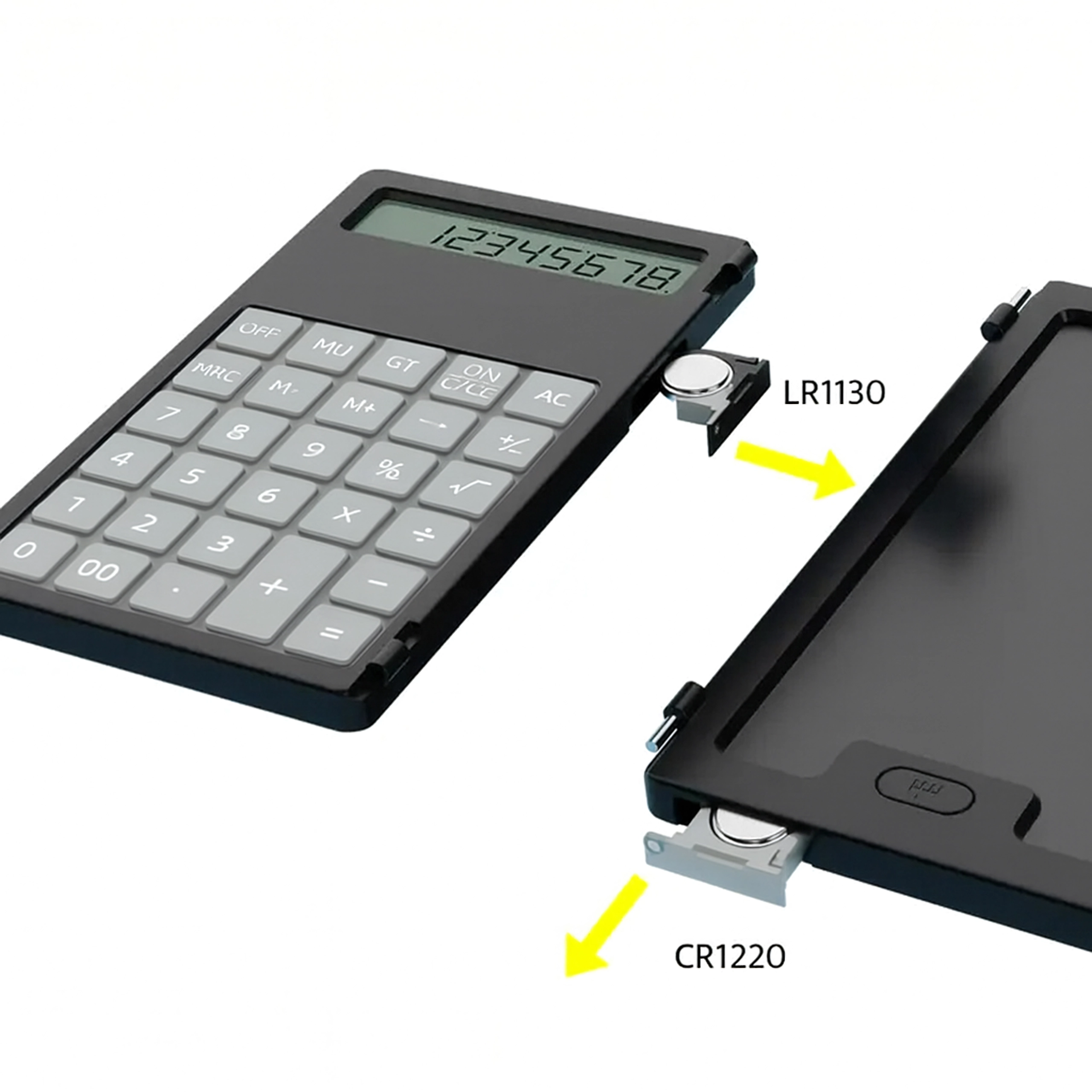 Sul lato sinistro una calcolatrice precisa, su quello destro un'area LCD per appunti rapidi – ideale per calcoli, formule e schizzi senza carta.