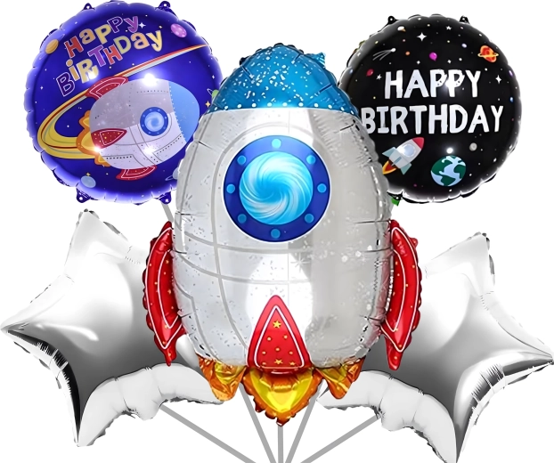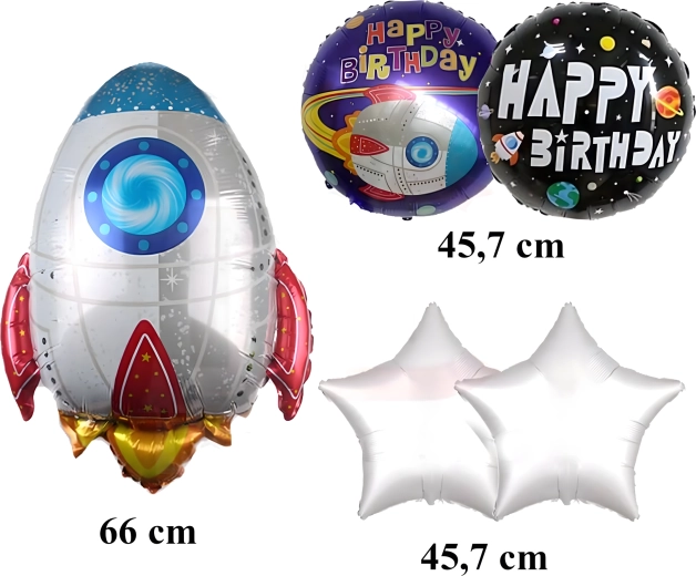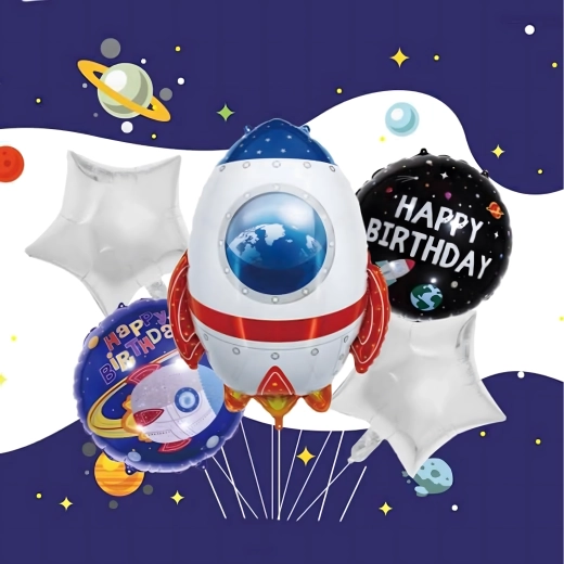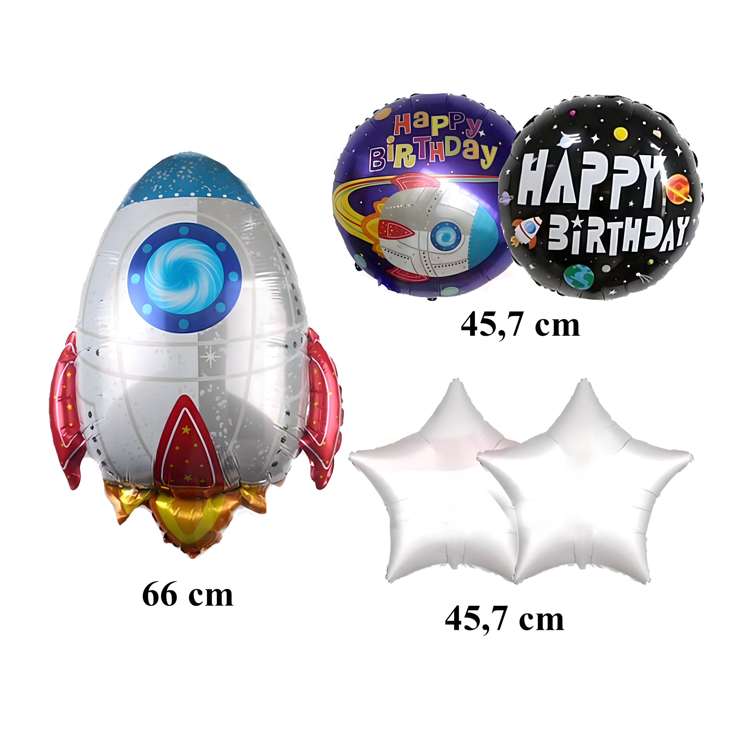 La decorazione è ideale per compleanni, party a tema e camerette dei bambini. Il set è pronto per essere gonfiato con elio o aria e si abbina facilmente ad altri accessori in stile spaziale.
