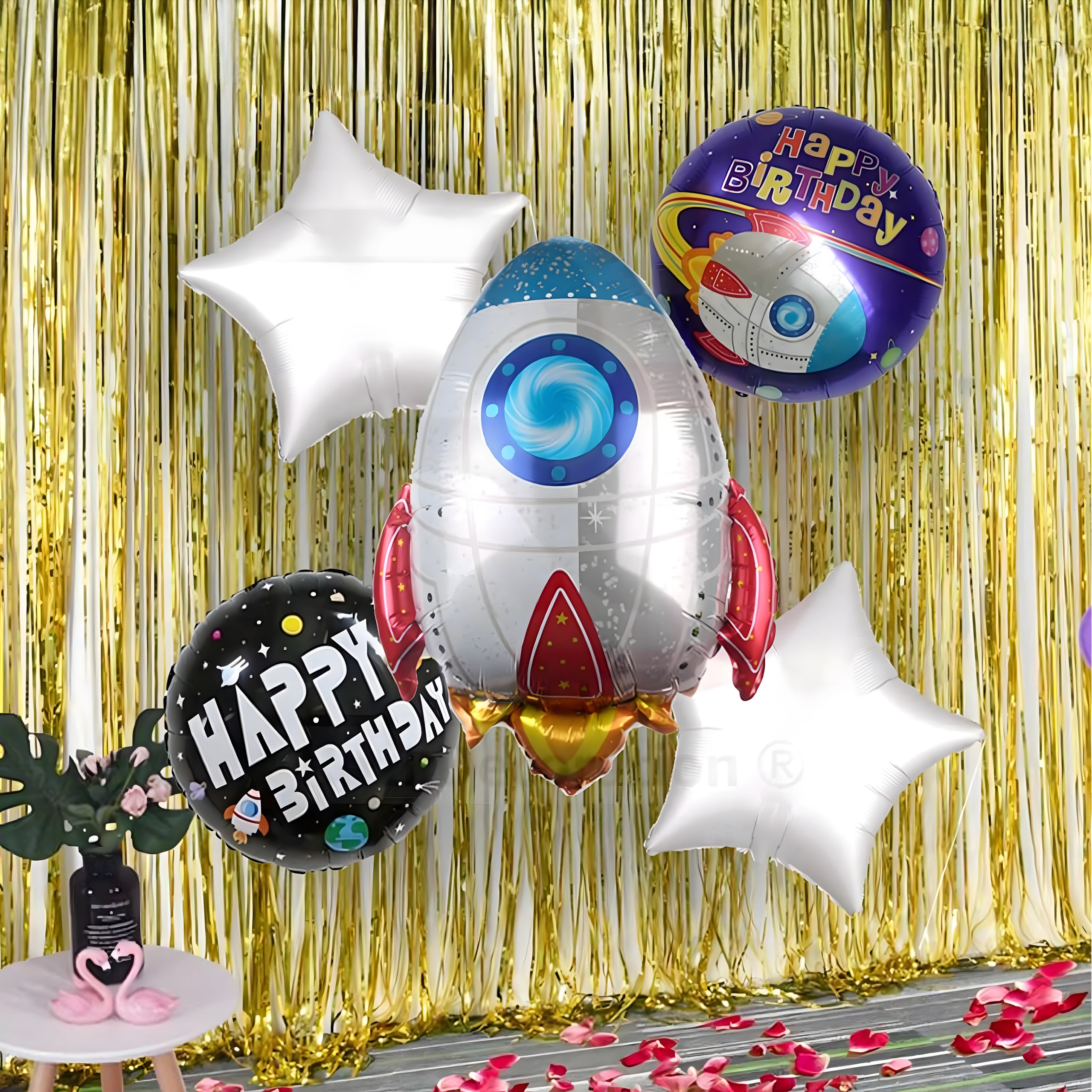 Scopri il divertimento in stile spaziale! Questo set include 5 palloncini in foil a forma di astronauta, razzo e stelline, ideali per feste di compleanno, party a tema e come decorazione per la cameretta. Perfetti anche per photobooth e scatti di stile.