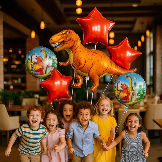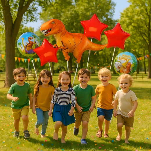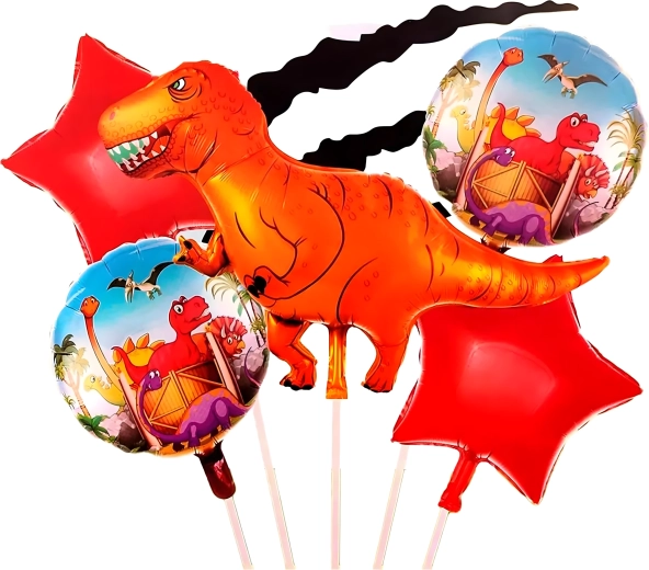 Un allegro set di palloncini a tema dinosauro illuminerà ogni festa. Include 1 grande palloncino dinosauro, 2 palloncini stampati e 2 stelle rosse – scelta perfetta per compleanni dei bambini e feste preistoriche.