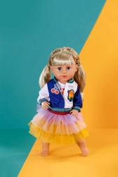 Regala alla tua bambola un look giocoso e alla moda. Questo outfit combina una comoda maglietta con volto di tigre, una cool giacca bicolore e una soffice gonna tutù in colori vivaci giallo, arancione e viola. Perfetto per il gioco quotidiano e per le occasioni speciali.