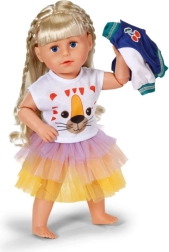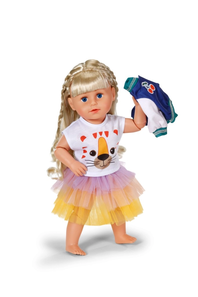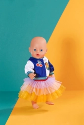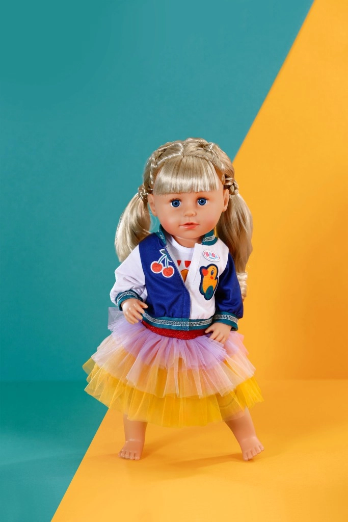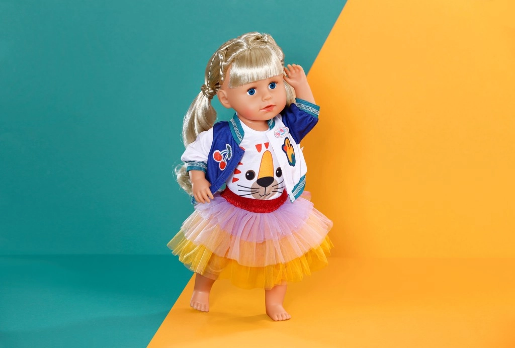 Un set alla moda per le bambole BABY BORN che aggiunge un tocco di colore alla quotidianità. Include una maglietta con volto di tigre, una giacca bicolore e una gonna tutù in giallo, arancione e viola. Adatto per bambole da 43 cm e per l’orsetto BABY BORN Teddy. Inclusa una gruccia in materiale riciclato e una lavorazione di qualità per un gioco duraturo.