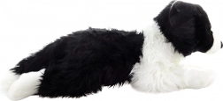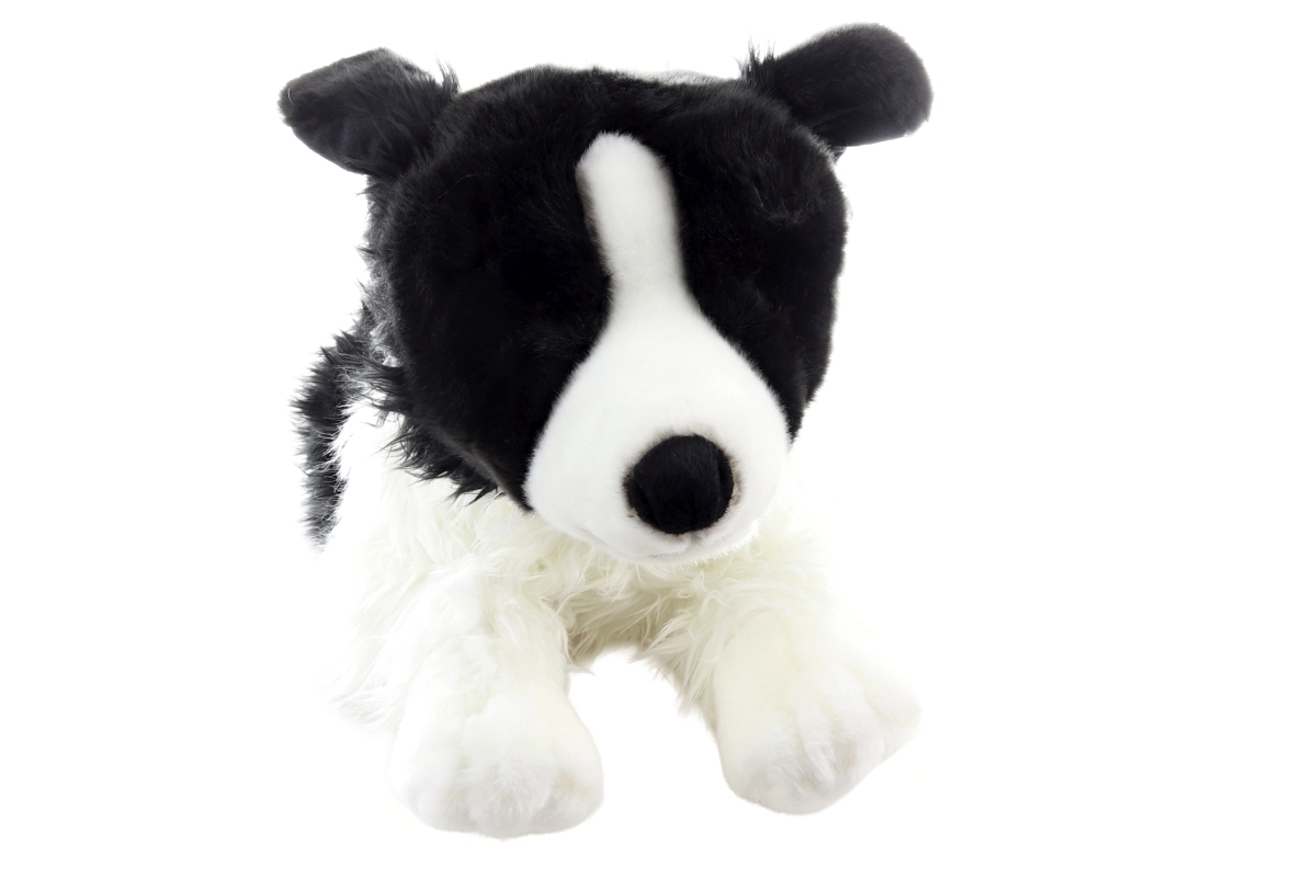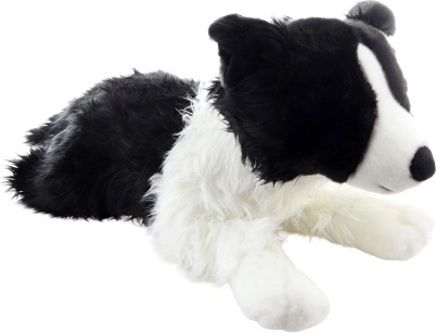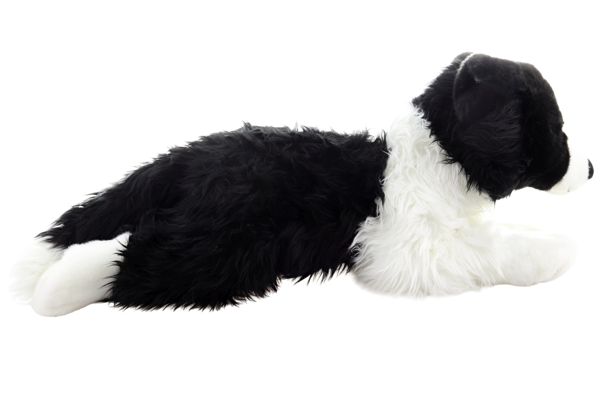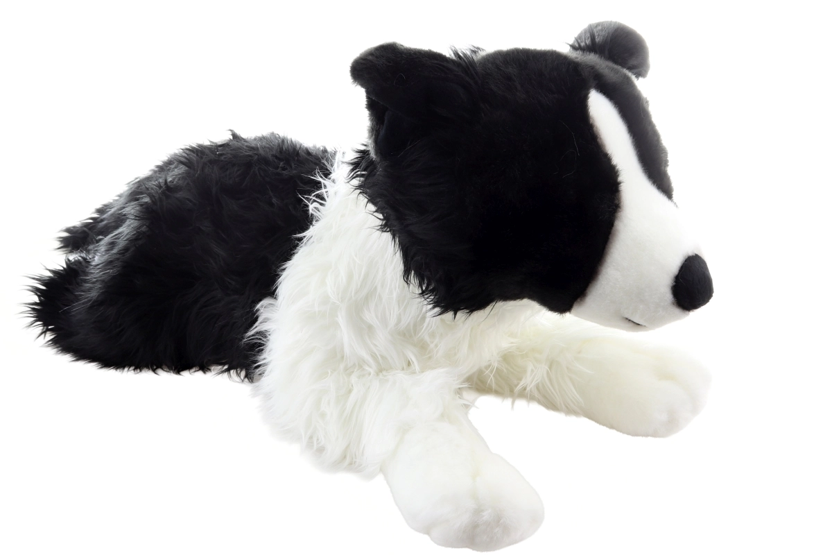 Questo grande cane di peluche Border Collie in posizione sdraiata conquista al primo tocco. È realizzato in materiale molto soffice e piacevole al tatto, che invita ad abbracci e coccole. La realistica combinazione di pelo bianco e nero e le orecchie adorabili donano al giocattolo un aspetto autentico.