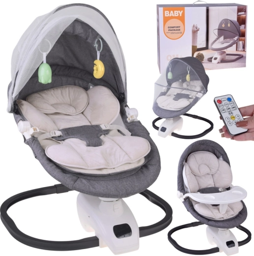 Pratica altalena-lettino 3 in 1 per bambini che combina comodo riposo, dondolio delicato e pappa in un unico prodotto. Grazie a telecomando, dondolio regolabile, melodie e timer calma facilmente il tuo bambino. Zanzariera, seduta imbottita e cinture di sicurezza garantiscono comfort e sicurezza fin dai primi giorni di vita.