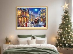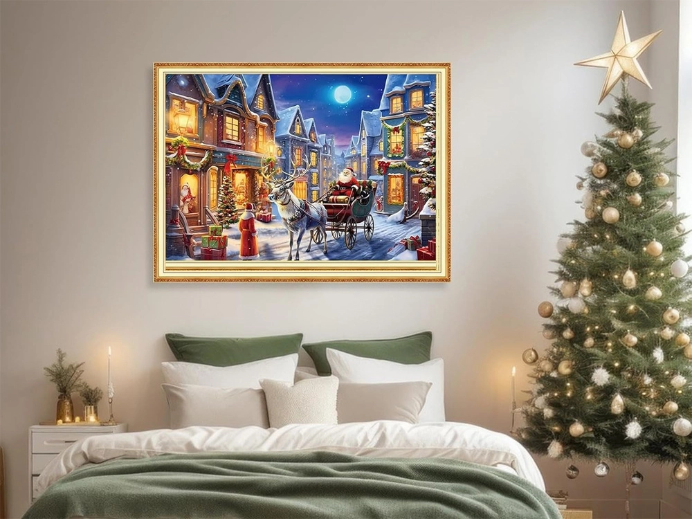 L’immagine finale 70 × 50 cm raffigura BABBO NATALE sulla slitta, una renna e un villaggio invernale: una decorazione stagionale perfetta.