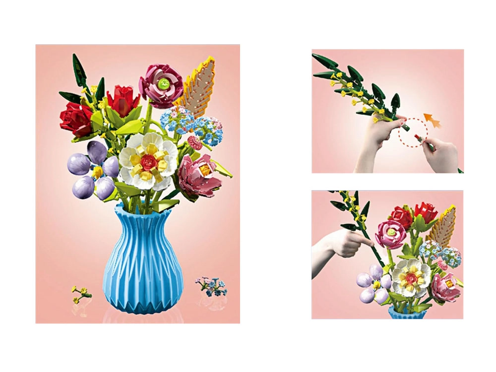 La confezione include pezzi suddivisi in sacchetti, schede con istruzioni dettagliate e un vaso di design. Monta, disponi e metti subito in mostra.