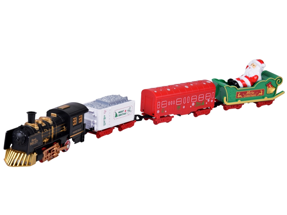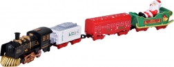 Il convoglio è composto da una locomotiva nera e tre diversi vagoni: un carro bianco per il carbone con la scritta Merry Christmas, un vagone rosso decorato e una slitta verde con Babbo Natale.