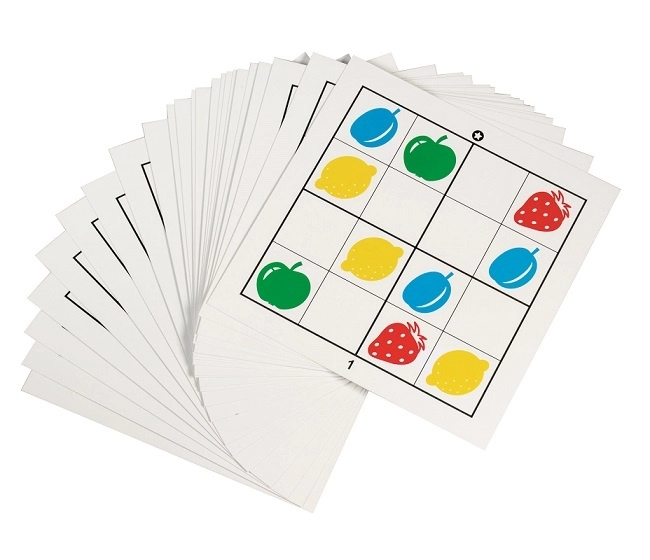 Questa versione intelligente del sudoku per i più piccoli offre regole semplici e tanto divertimento. I bambini completano le caselle vuote nella griglia 4×4 affinché le stesse immagini non si ripetano in riga, colonna o nei quadrati – proprio come nel sudoku classico, ma con allegre immagini di frutta.