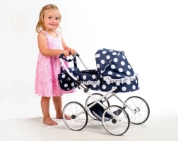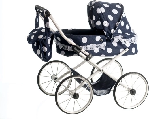 Elegante passeggino per bambole in design retrò che farà felice ogni piccola mamma. Offre una versione nera a pois con pizzo elegante, un manico regolabile di 55 cm per una guida comoda e una capottina richiudibile per una facile manipolazione. Inclusi una borsa sul manico e un pratico cestino inferiore per piccoli oggetti.