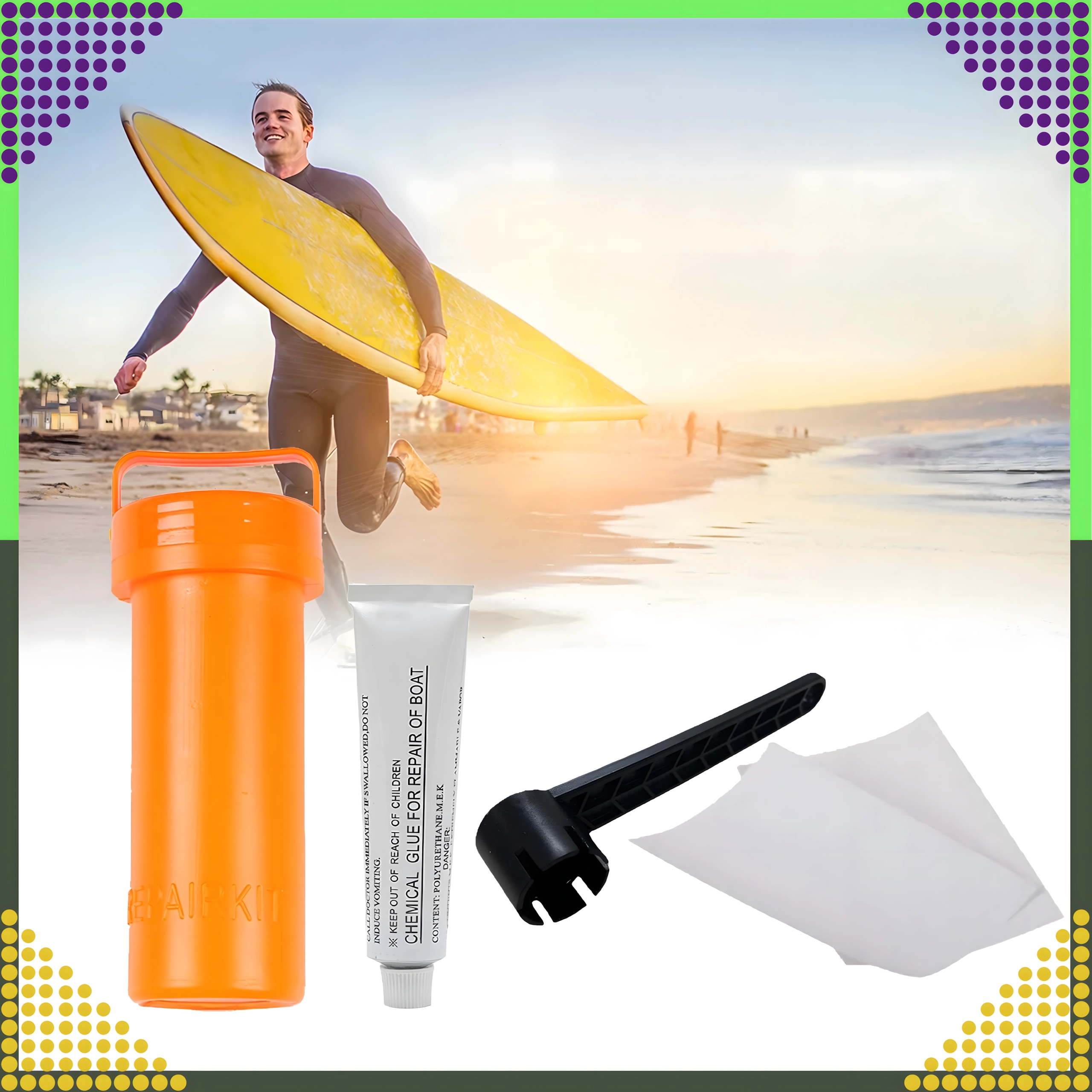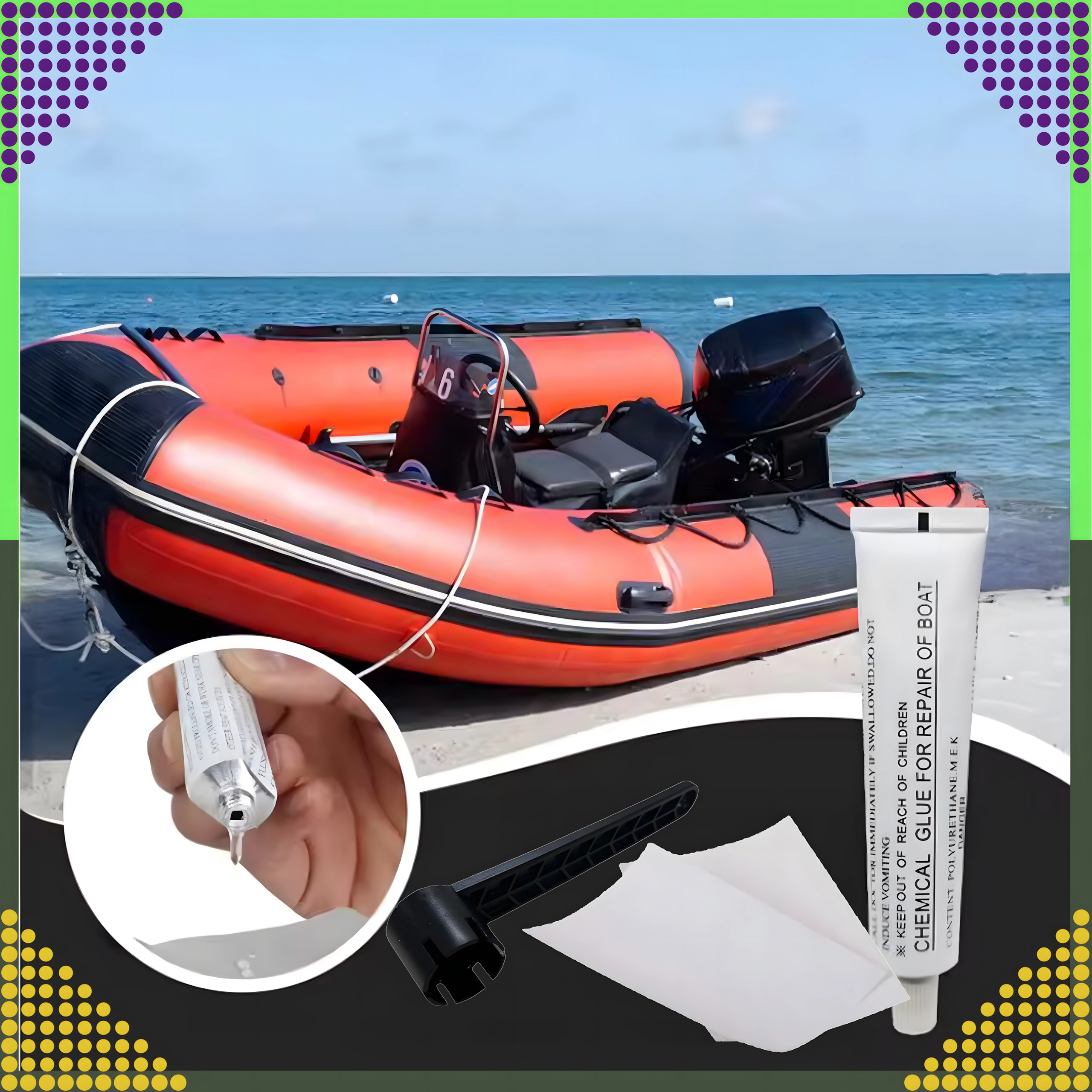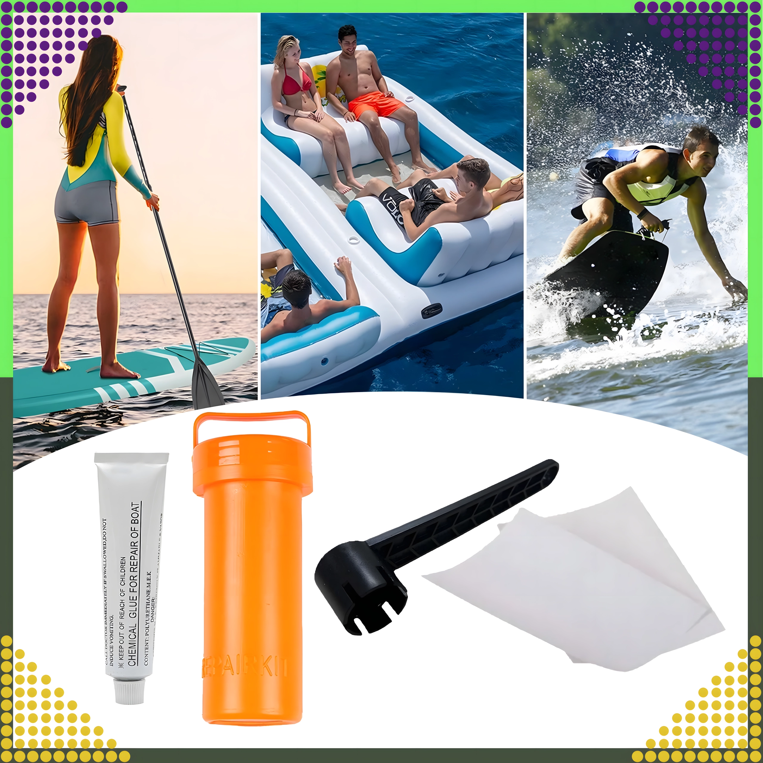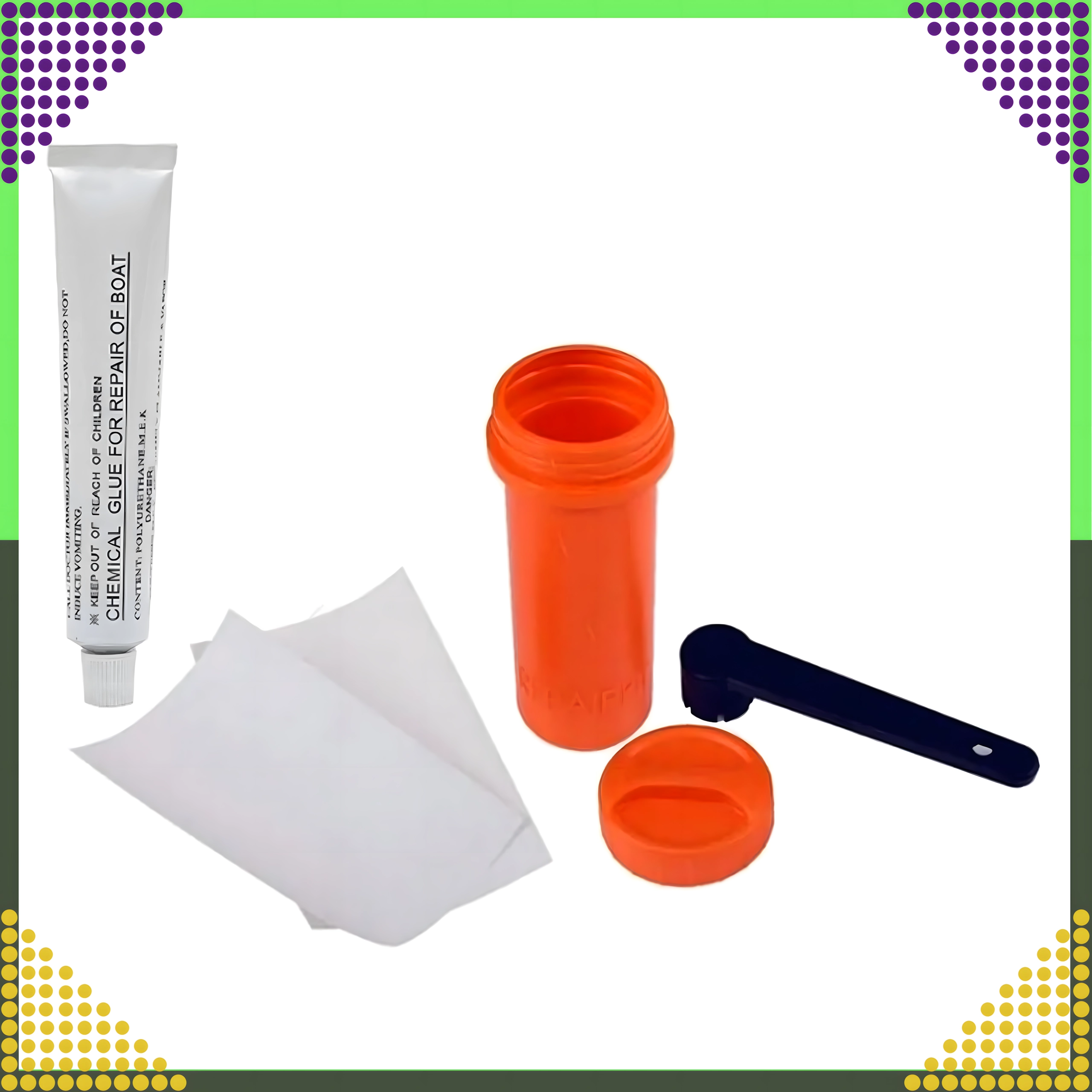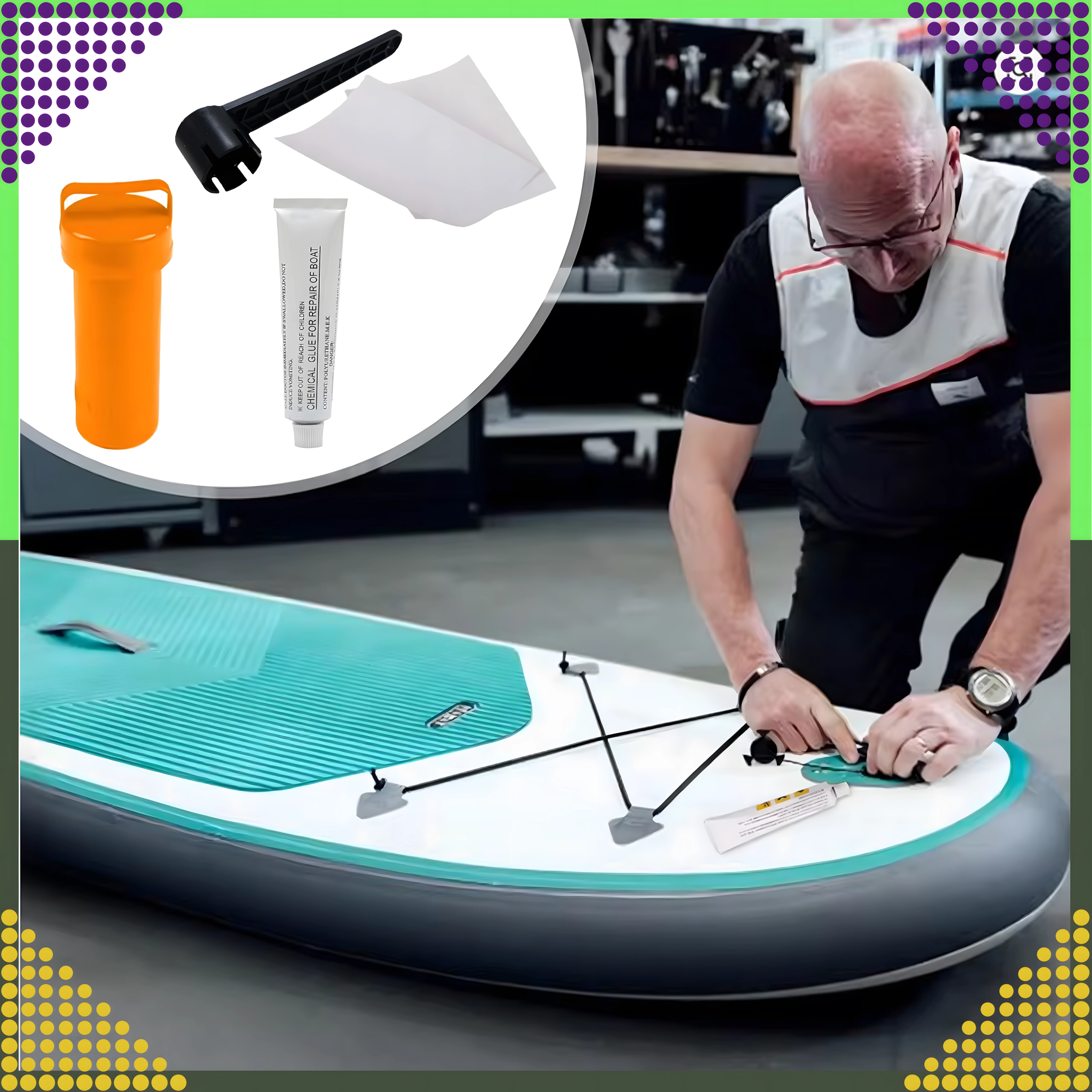 Include colla chimica e fogli di toppa per un fissaggio solido e duraturo su PVC e superfici gonfiabili. Ideale per paddleboard, raft, materassi e altra attrezzatura gonfiabile.