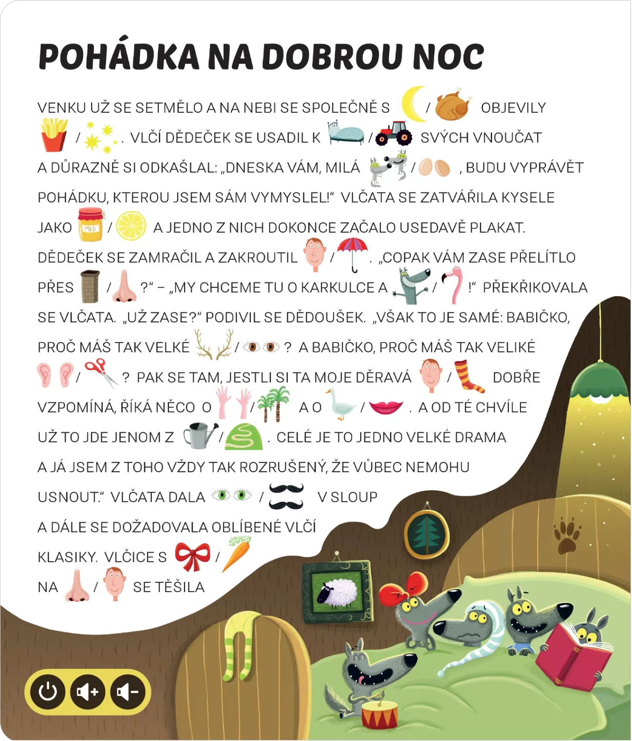 Crea a casa un’atmosfera da fiaba serale. Nel libro Lettura con immagini: Le fiabe del nonno lupo i bambini troveranno 8 storie di mostri da vivere in due modi – classico o divertente. Le immagini inserite nel testo aiutano l’orientamento e motivano alla lettura autonoma. Le voci sono di Michal Holán e Klára Oltová.