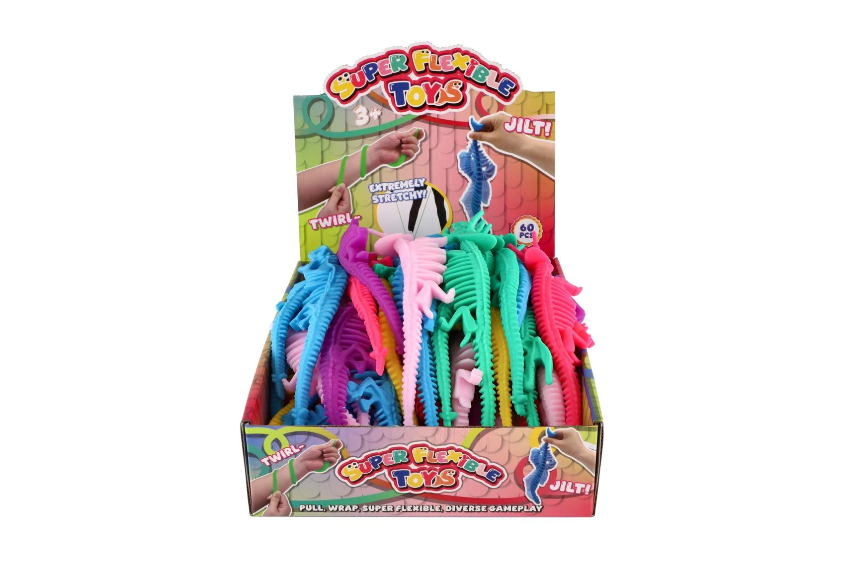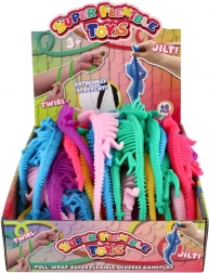 Colorato giocattolo antistress a forma di scheletro di dinosauro in silicone piacevolmente morbido, ideale per schiacciare, allungare e rilassarsi sotto stress. Lunghezza 22 cm, disponibile in 6 colori vivaci, perfetto per bambini e adulti come fidget toy per alleviare la tensione.