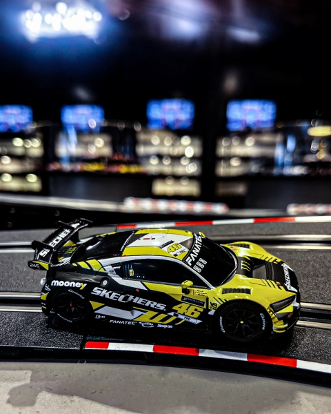 Elegante auto per piste GO!!! in scala 1:43 ispirata all’iconico pilota VALENTINO ROSSI. Offre contatto affidabile grazie alle doppie spazzole, ottima stabilità con magnete e guida precisa grazie alla slitta guida.