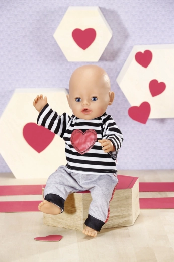 L’abbigliamento Dolly Moda è progettato per essere facilmente combinato e condiviso tra diverse bambole. Questa tuta a righe con felpa e pantaloni è ideale sia per il gioco confortevole in casa sia per le uscite di stile delle bambole. Il grande cuore sulle righe bianche e nere e i pantaloni grigi con dettagli a contrasto donano all’outfit un look moderno.