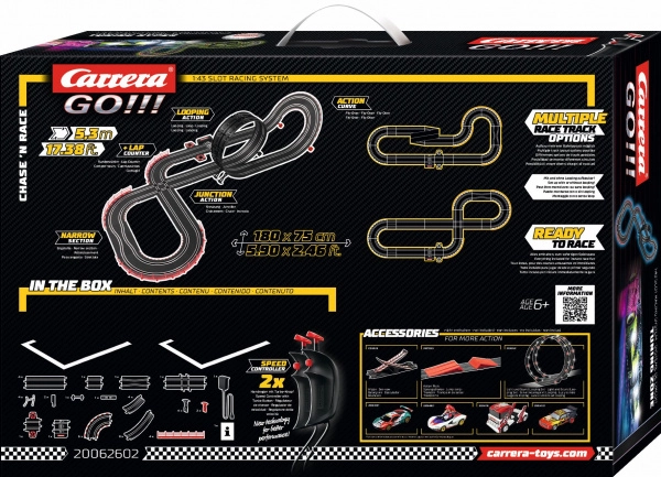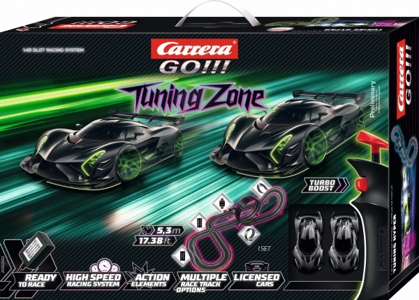 La pista CARRERA GO Tuning Zone porta adrenalina sulla pista di casa. Su una lunghezza di 5,3 metri ti aspetta una combinazione varia di elementi: looping, parete verticale, incrocio, restringimento, rettilinei veloci e curve tecniche. Due hypercar dettagliate in scala 1:43 sono pronte alla sfida, mentre i controller con funzione Turbo spingono la velocità al massimo.