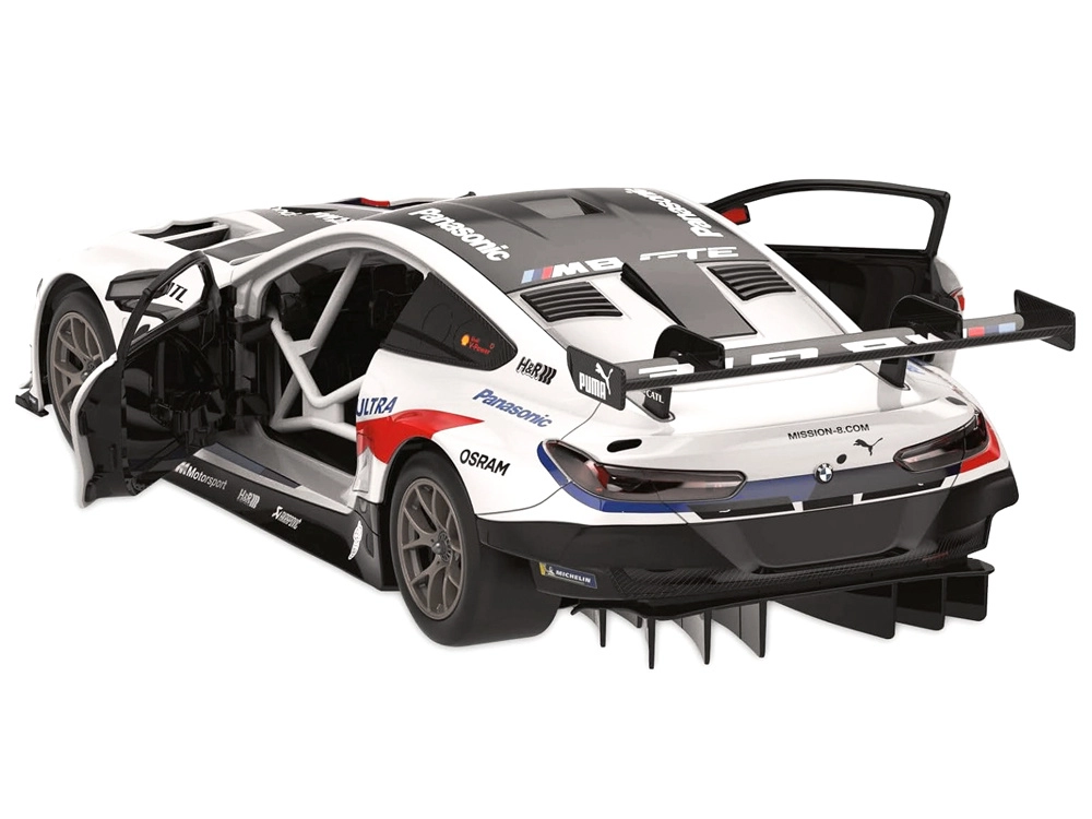 Carrozzeria autentica, elementi aerodinamici, porte apribili e interni realistici con adesivi BMW Motorsport per la massima credibilità.