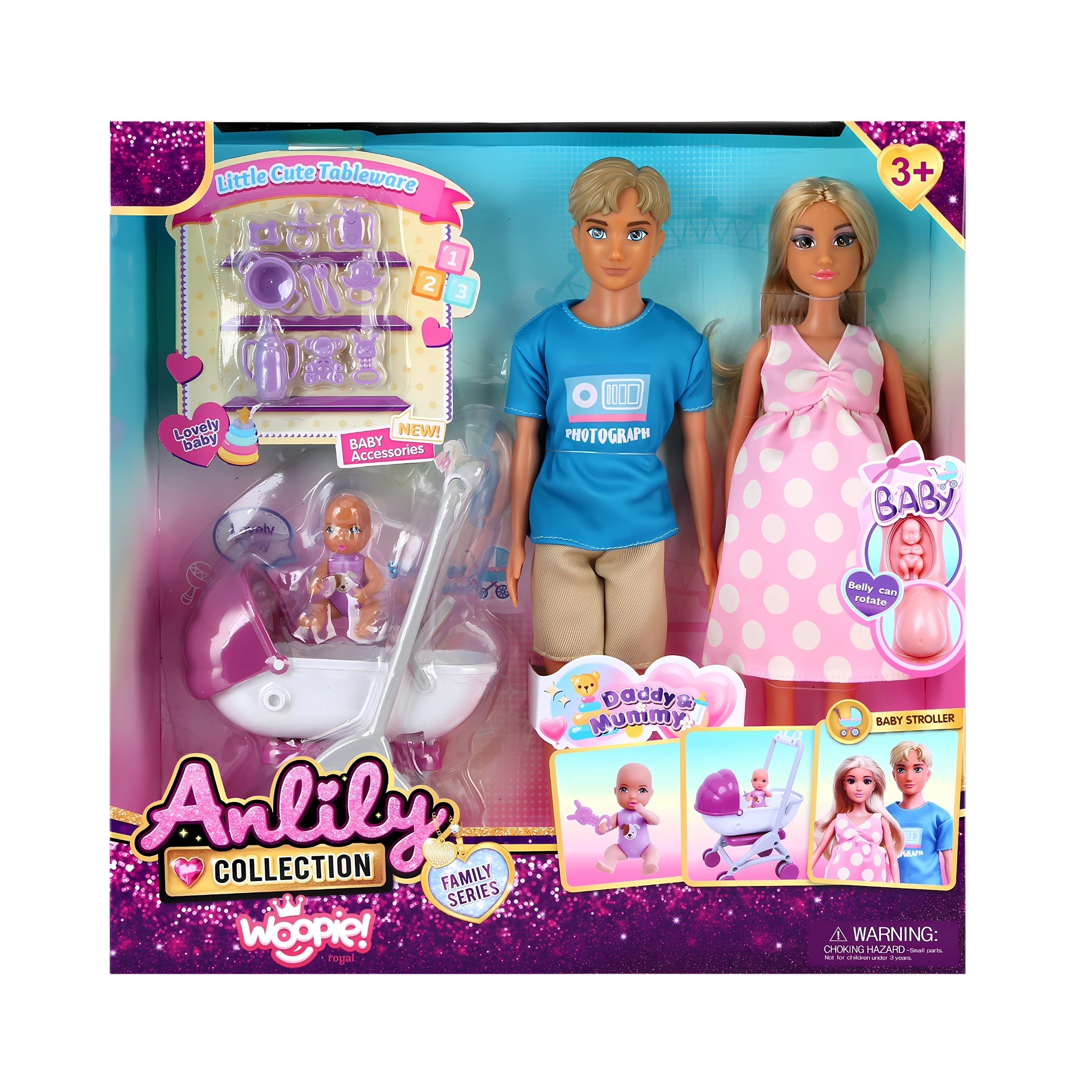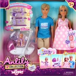 Mamma in gravidanza con bebè estraibile, papà, bebè, passeggino, accessori (biberon, ciotola, ciuccio, pannolini, pettine, piattino)