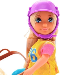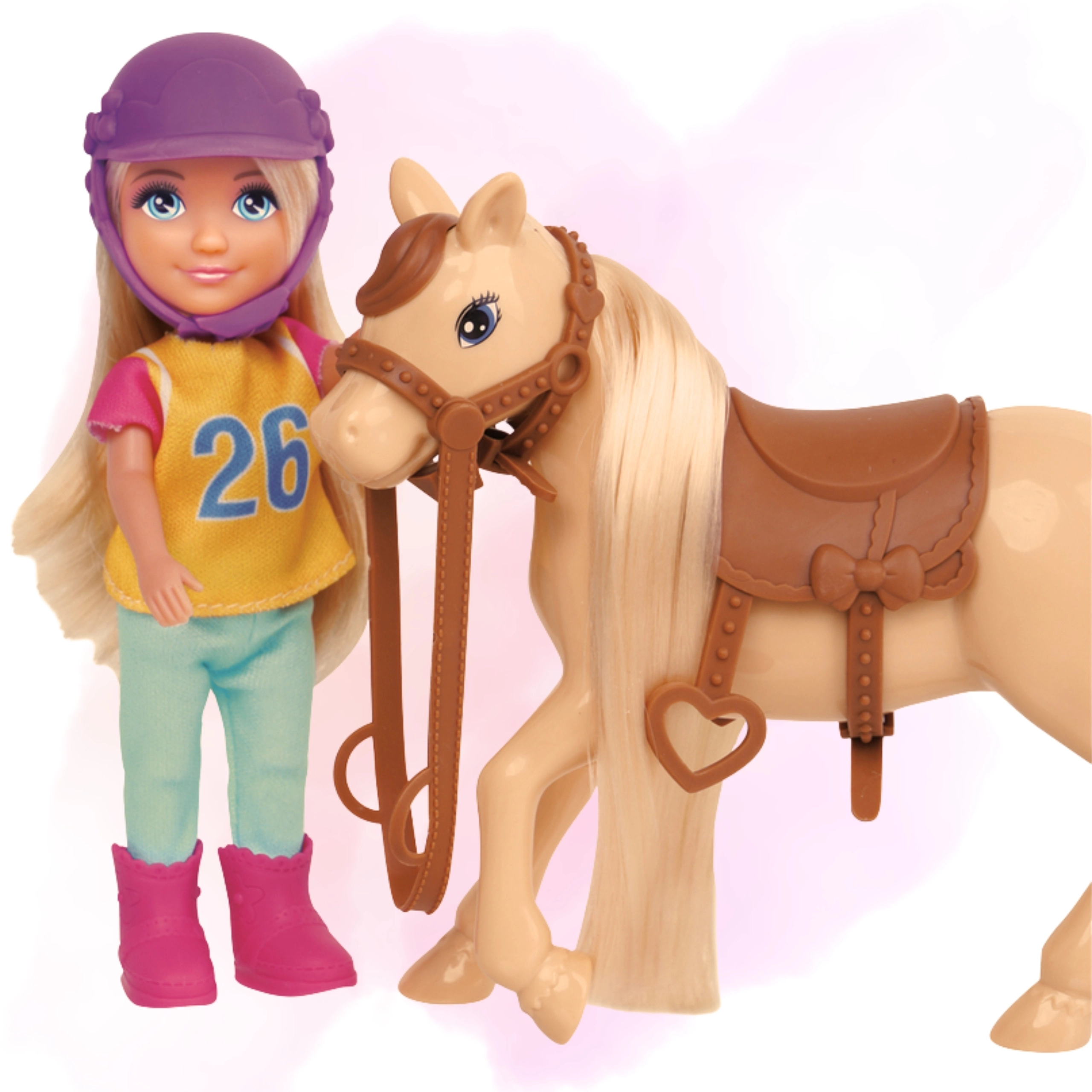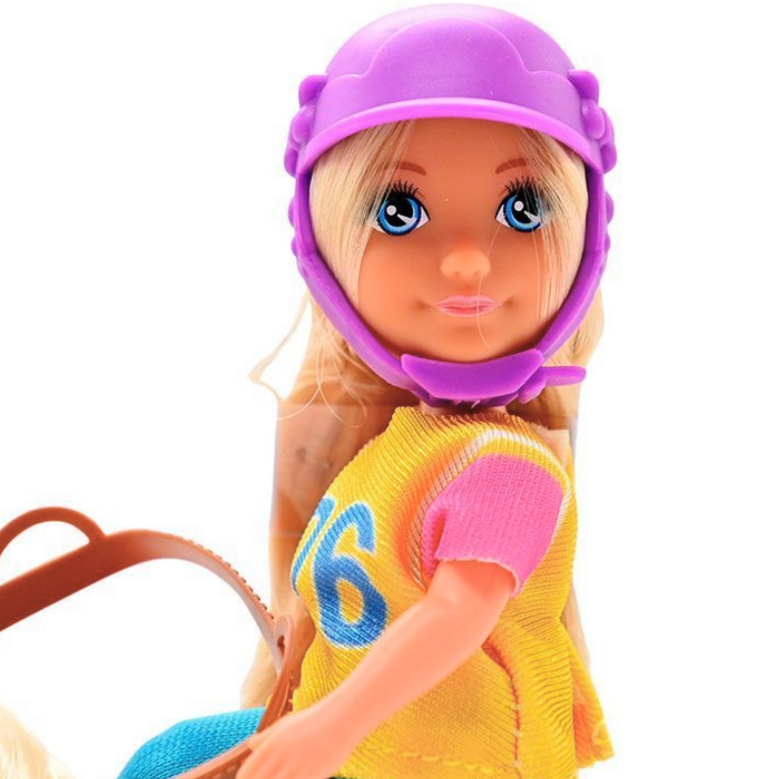 - bambola cavallerizza, casco protettivo, figura di cavallo con criniera e coda chiare, sella e briglie