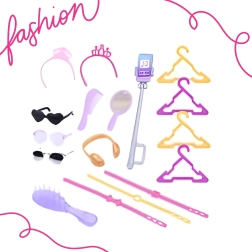 - Bambola Lili con abito dorato, 8 abiti aggiuntivi (9 in totale), 13 paia di scarpe, 6 borse, occhiali da sole, spazzole per capelli, cerchietti e decorazioni, grucce colorate, confezione regalo