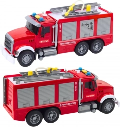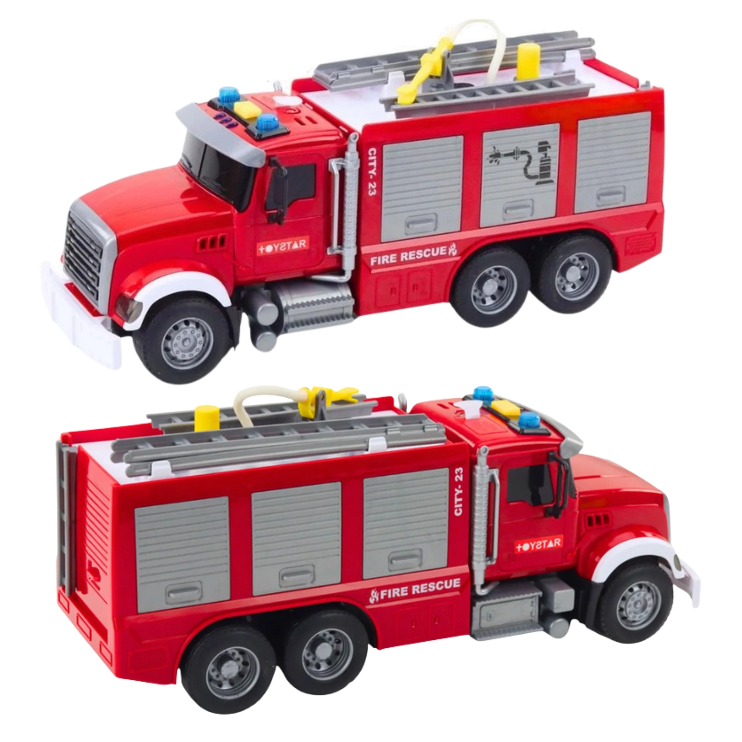 - Camion dei pompieri con spruzzo d’acqua, serbatoio dell’acqua, tubo flessibile con beccuccio, pulsante/pompa per il pompaggio, pulsanti interattivi per luci e suoni