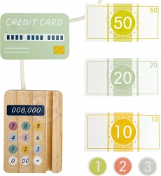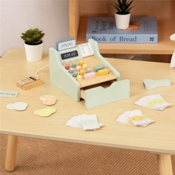 Il set include tutto ciò di cui ha bisogno un piccolo commesso: cassa in legno con pulsanti colorati, scanner, lettore di carte, carta di pagamento, monete e banconote. Il gioco sviluppa il pensiero logico, le abilità matematiche, le capacità di coordinazione e la comunicazione durante il gioco di ruolo tra venditore e cliente.