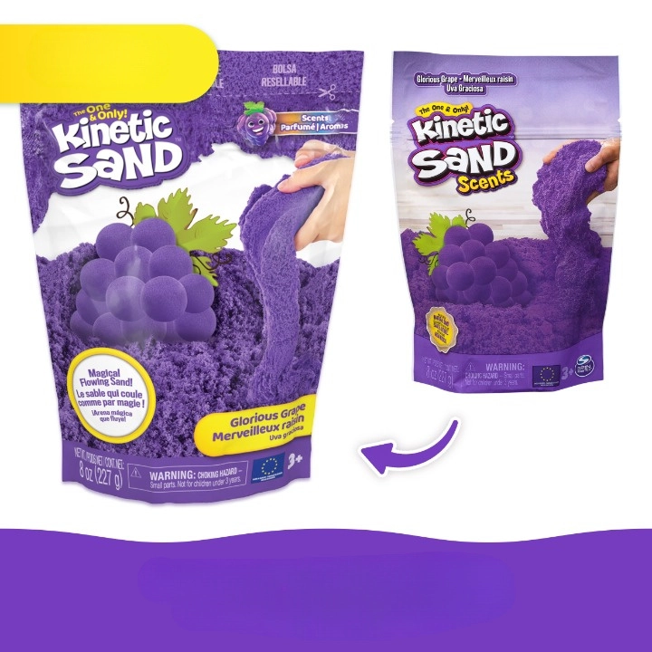 Scopri la sabbia cinetica profumata Kinetic Sand Scents al gusto uva del marchio Spin Master. La sabbia sembra bagnata ma le mani restano asciutte, non si secca mai, non si sbriciola e si pulisce facilmente. Perfetta per creare forme e per lo sviluppo della motricità fine dei bambini.