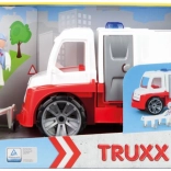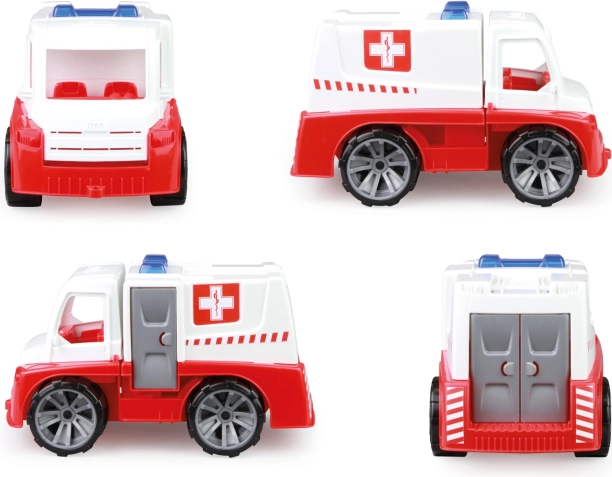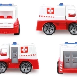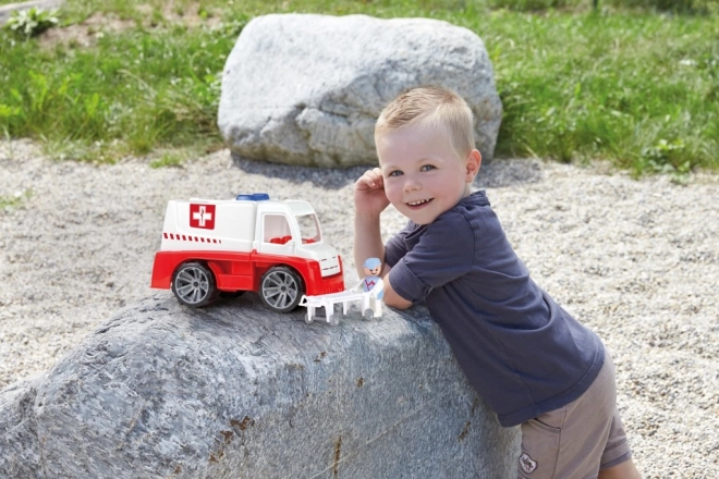 Robusta ambulanza in plastica LENA TRUXX per piccoli soccorritori offre funzionalità meccanica, porte apribili e cabina ribaltabile. Include una figurina del soccorritore e una barella per un gioco realistico. Lunghezza 29 cm, adatta da 2 anni, ideale per la sabbia e per la casa, senza batterie.