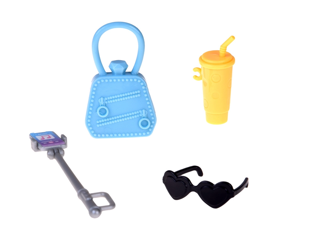 Borsetta, occhiali a cuoricino, bicchierino con bevanda e selfie stick con smartphone (finti) ampliano le possibilità di gioco.
