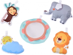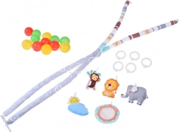 Peluches a forma di animaletti, sole con nuvoletta, specchietto per bambini e palline colorate sostengono vista, tatto e udito e motivano ad allungarsi, afferrare e girarsi.