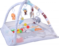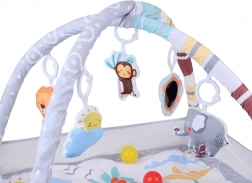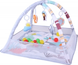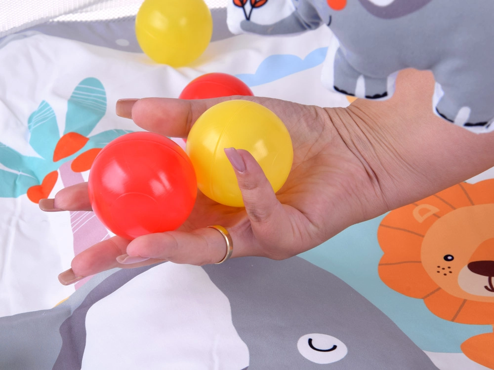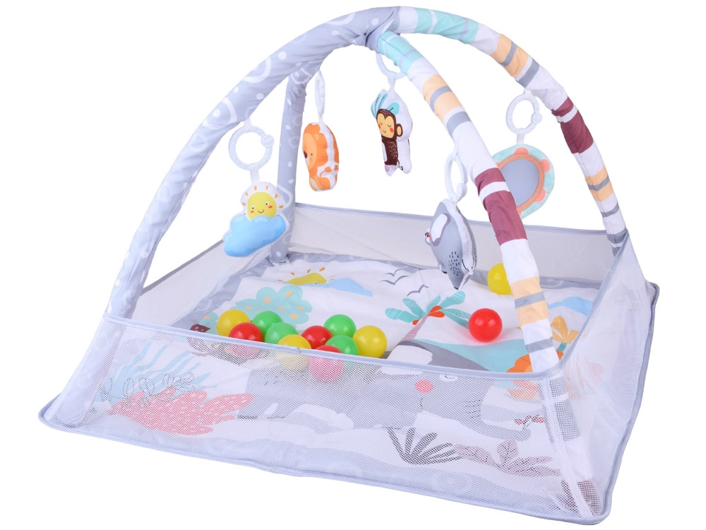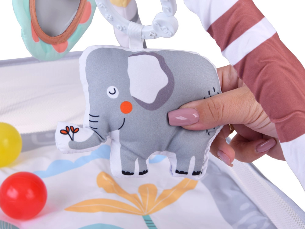 Questo tappetino educativo con morbida imbottitura e allegri animaletti crea un angolo sicuro per scoprire il mondo fin dai primi giorni. Due archi incrociati, facilmente removibili, sorreggono i giochi sospesi che invitano ad osservare, afferrare e muoversi. Le sponde in rete aiutano a mantenere giochi e palline all'interno e aumentano la sensazione di sicurezza.
