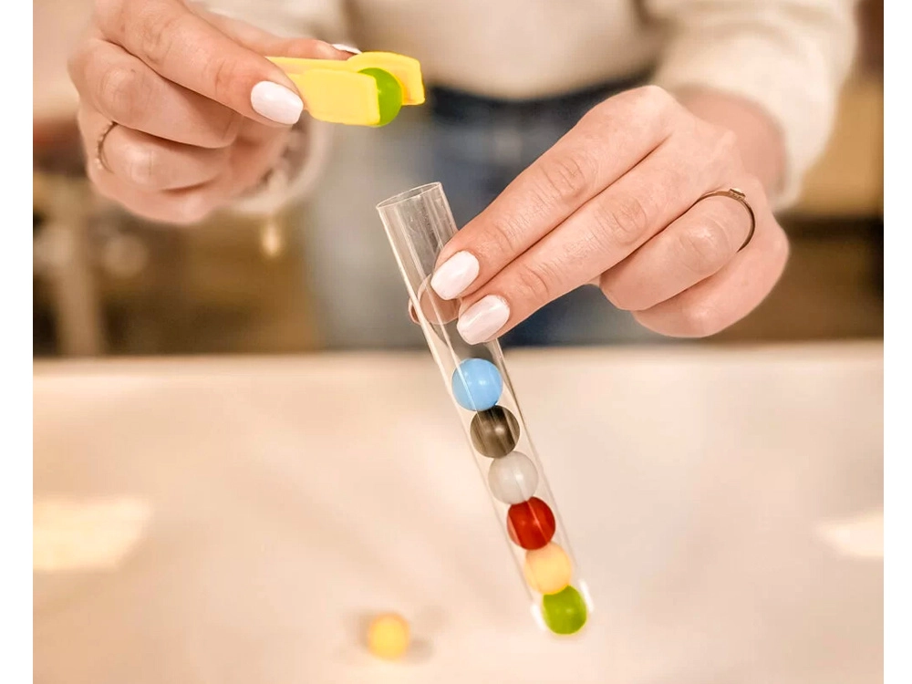 Questo originale gioco educativo ispirato al metodo MONTESSORI promuove l’apprendimento attraverso l’azione. I bambini afferrano le palline colorate con la pinzetta e le inseriscono nella provetta, liberamente oppure secondo le carte modello. In questo modo allenano la precisione dei movimenti, la pazienza e la coordinazione visuo-motoria.