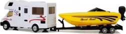 La brillante “Speed Boat” gialla sul rimorchio a due assi si aggancia facilmente al caravan. I bambini possono provare sia il trasporto della barca sia la guida del veicolo da solo.