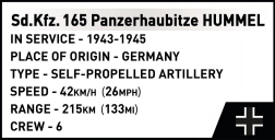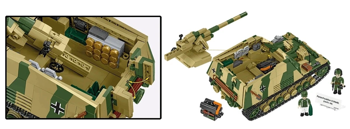 Replica autentica dell’obice semovente tedesco Panzerhaubitze HUMMEL, realizzata con 1118 pezzi COBI di alta qualità in scala 1:28. Grazie alle proporzioni realistiche, alla sovrastruttura di combattimento aperta, alla lunga canna e al telaio fedelmente riprodotto con cingoli, otterrai un modello d’effetto per esposizione e gioco. Inclusi il motore Maybach HL120 TRM esponibile separatamente e la possibilità di rimuovere l’obice da 15 cm sFH 18 (L/30).