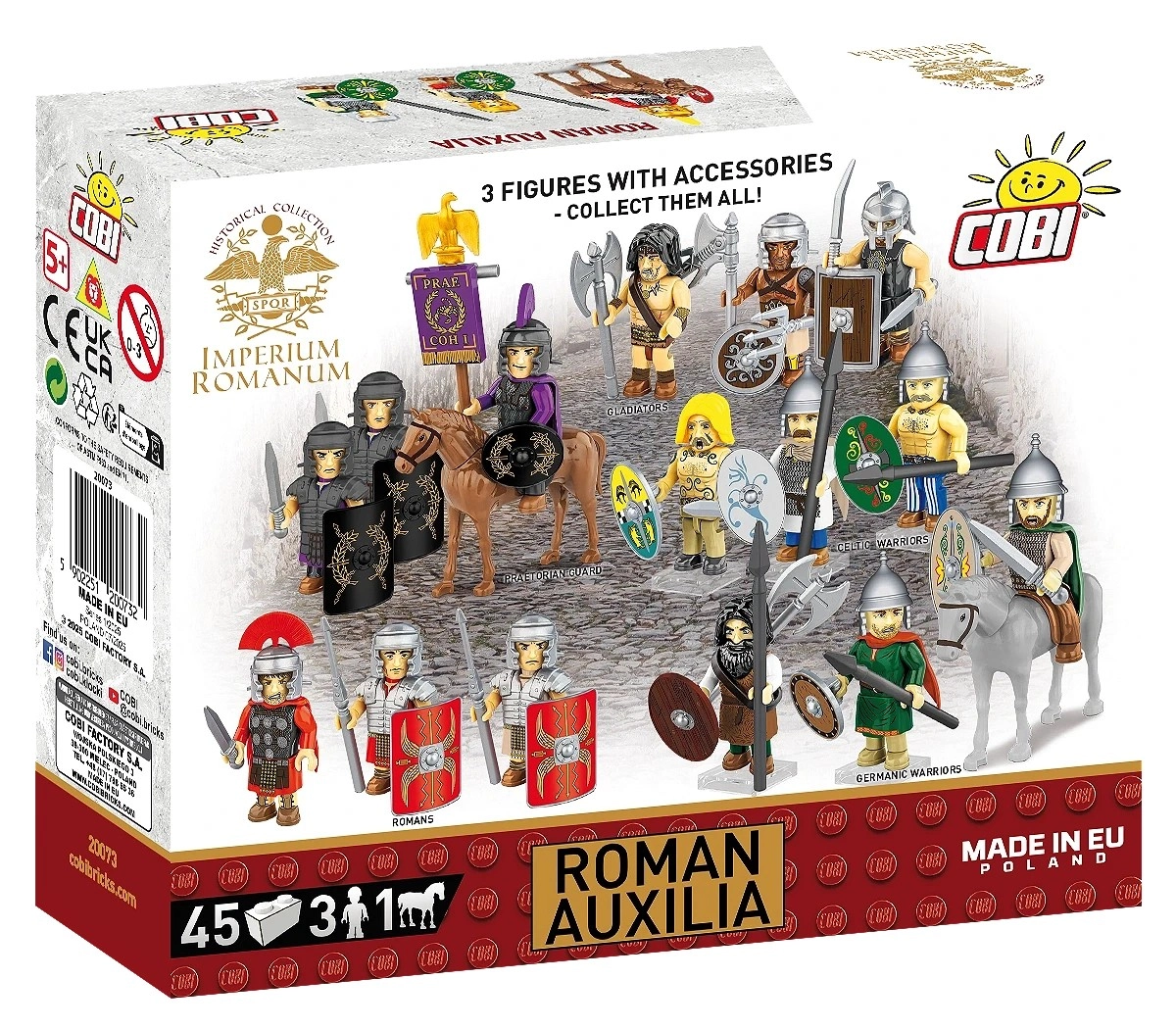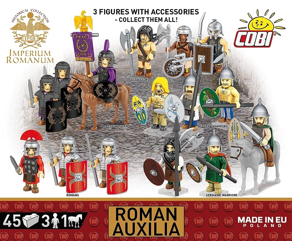 Scopri il mondo di IMPERIUM ROMANUM con il set ROMAN AUXILIA da 45 pezzi. Ottieni 3 minifigure dettagliate (2 fanti e 1 cavaliere), un cavallo con sella e ricchi accessori tra cui nuovi scudi ovali, stampe di lorica hamata e mantelli. Stampe durevoli senza adesivi di alta qualità, istruzioni intuitive e compatibilità con altri marchi rendono questo set una scelta perfetta per bambini dagli 8 anni e per collezionisti adulti.