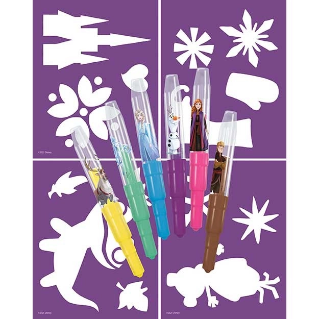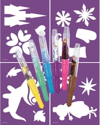 Set creativo a tema Frozen con 6 pennarelli a soffio colorati e 4 stencil di carta. I bambini possono creare facilmente i propri disegni, decorazioni e biglietti. Ideale per lo sviluppo della fantasia, della pazienza e della motricità fine. Adatto ai bambini dai 3 anni.