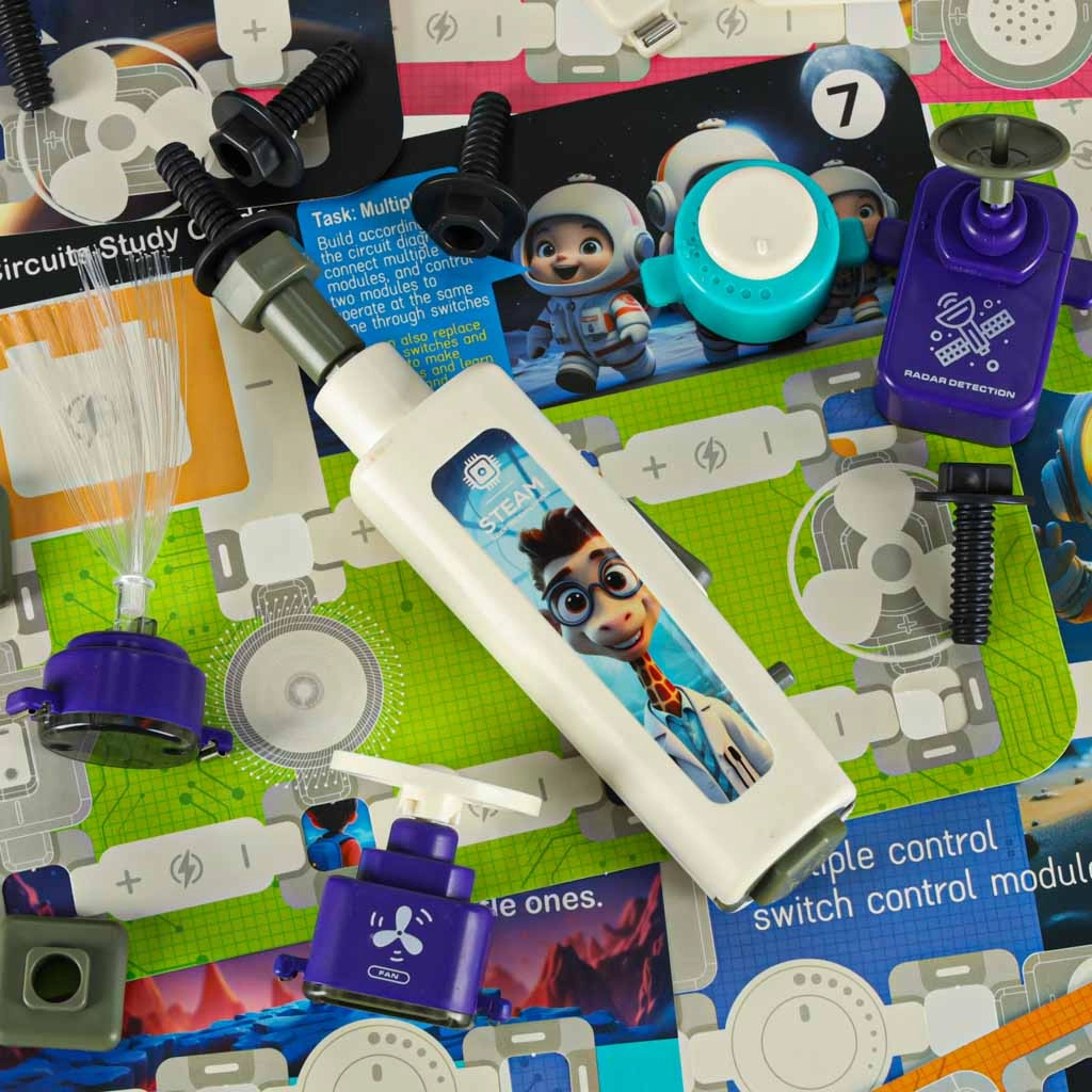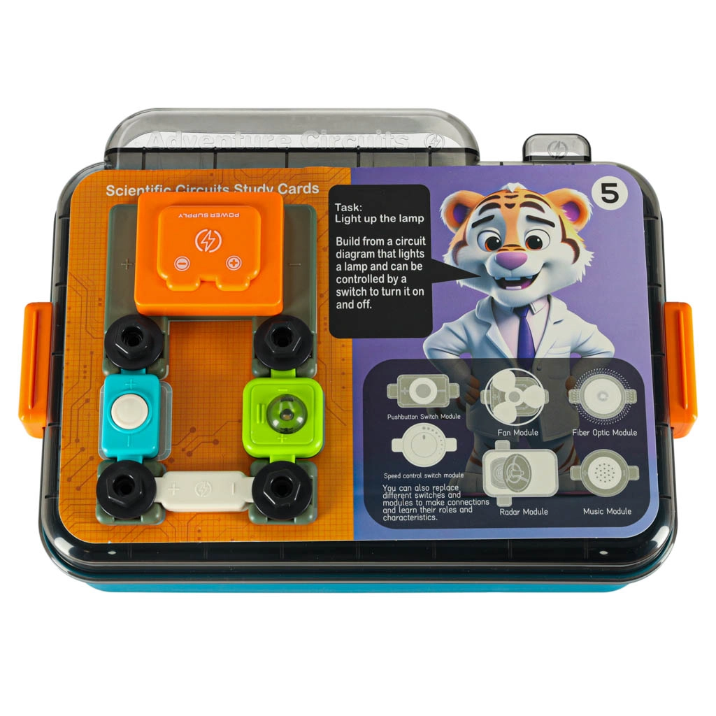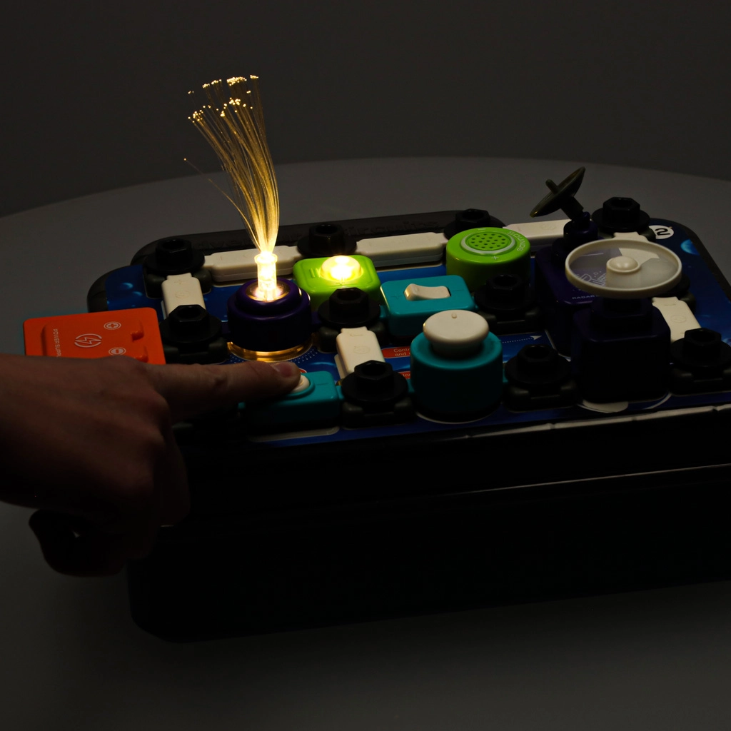 Questo intelligente set STEM offre ai bambini un’introduzione sicura e concreta al mondo dei circuiti elettrici. Gli elementi modulari si collegano con semplicità e ogni componente inserito mostra subito il risultato: luce accesa, melodia riprodotta o ventolina in rotazione. La chiave luminosa interattiva del circuito aiuta a comprendere cosa significa chiudere un circuito.