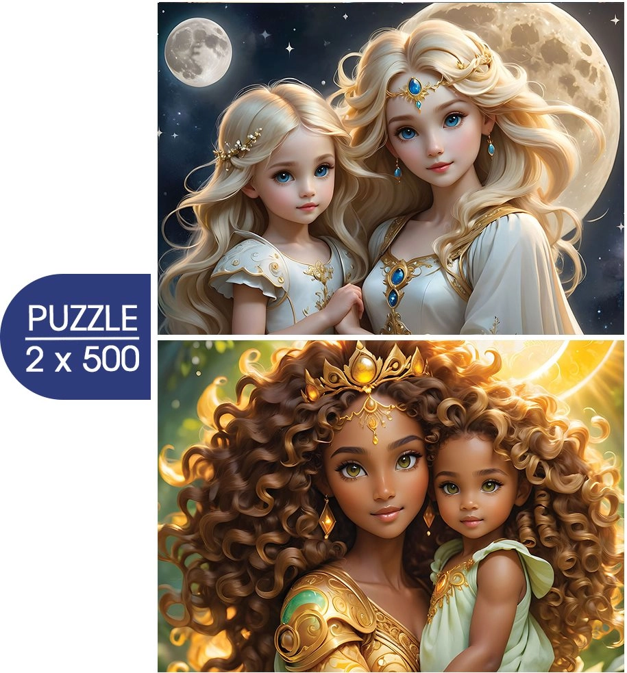 Goditi il relax con un elegante set di due puzzle da 500 pezzi ciascuno con il motivo di madre e figlia ispirato ai simboli di luna e sole. Ideale per gli amanti delle illustrazioni artistiche, della lavorazione di qualità e dei momenti di tranquillità a casa.