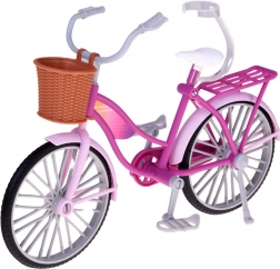 La bici rosa‑viola con cestino anteriore, portapacchi posteriore, pedali e ruote a razze rotola liberamente ed è facile da controllare. La sella con supporto mantiene la bambola stabile durante la “guida”.