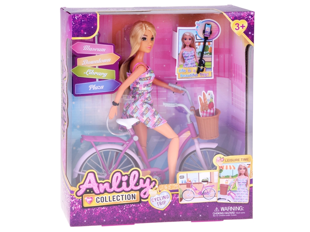 La stilosa bambola ANLILY sulla bici rosa‑viola offre ore di gioco di fantasia. Ha braccia e gambe snodate, un moderno abito FUNKY, sneakers bianche e include telefono con bastone per selfie per catturare ogni avventura. La bici con cestino anteriore e portapacchi posteriore si muove davvero, per un divertimento realistico e fluido.
