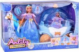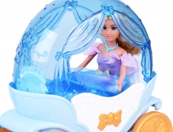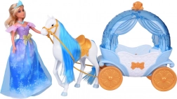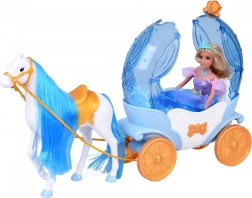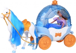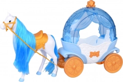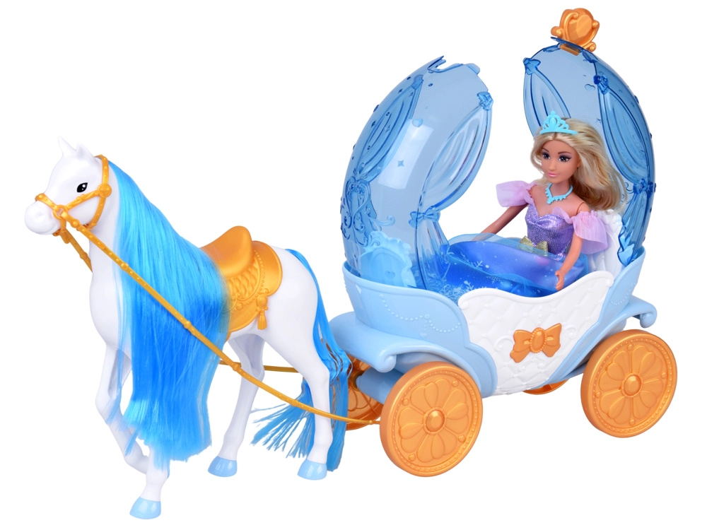 La carrozza “zucca” blu‑bianca con accenti dorati ha la parte superiore apribile, così la bambola si accomoda facilmente all’interno. Il cavallo bianco con criniera blu è dotato di sella, briglie e finimenti; la carrozza ha ruote mobili per un movimento scorrevole sul pavimento.
