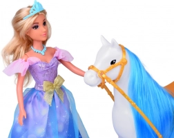 Questa elegante principessa con lungo abito nei toni del blu, viola e rosa, con dettagli lucenti e fiocco dorato, incanta al primo sguardo. Grazie ai lunghi capelli biondi, alla tiara e alla collana, i bambini possono divertirsi a pettinare, vestire e creare le proprie scene da fiaba.