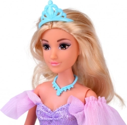 La bambola ha lunghi capelli biondi, una tiara turchese e una collana. L’abito nei toni blu‑viola, con fiocco dorato e motivi di neve, aggiunge magia a ogni ballo.