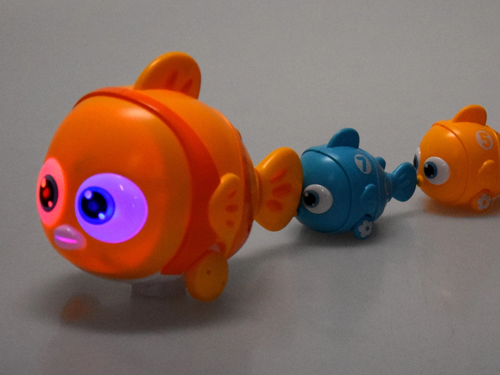La famigliola di pesci interattiva trasforma ogni giorno in un’avventura creativa. Il grande pesce a batterie avanza, illumina gli occhi e suona, mentre i pesciolini, grazie ai magneti, si agganciano per coda o bocca formando un colorato trenino acquatico. Ogni pesciolino ha numeri stampati, così i bambini possono esercitare il conteggio e semplici sequenze.
