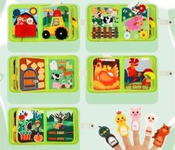 I bambini conoscono gli animali da fattoria, i colori, le forme e le colture. Spostando i pezzi creano scenette proprie e sviluppano vocabolario e fantasia.