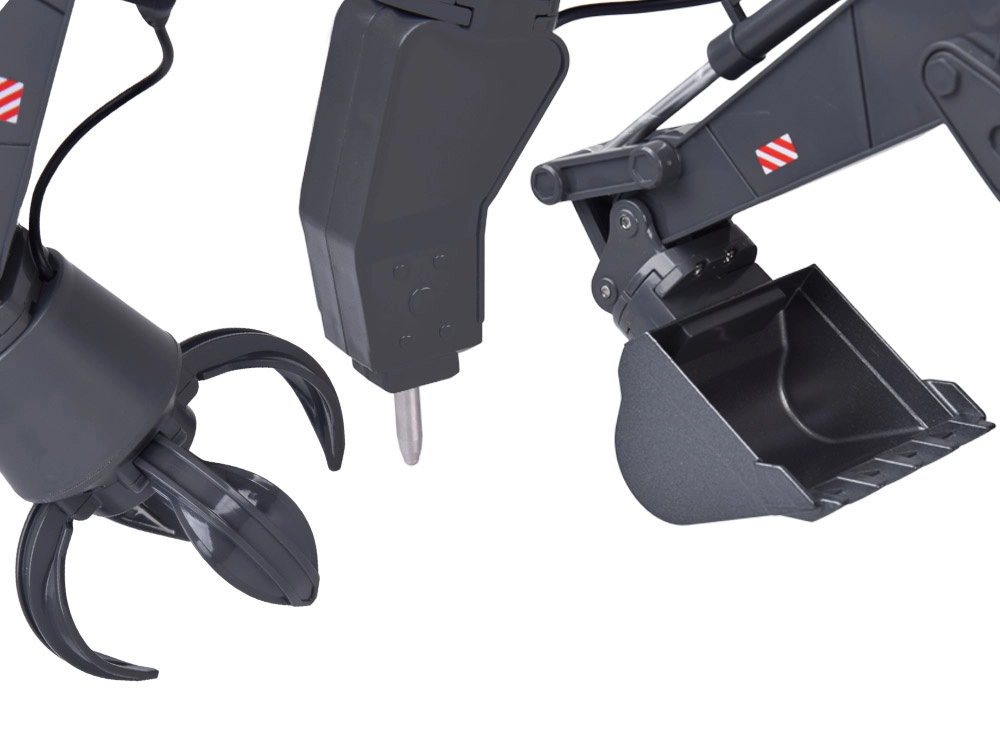 Inclusi tre accessori intercambiabili – benna, pinza e martello demolitore – che adattano facilmente l’escavatore a compiti diversi. Illuminazione LED ed effetti sonori possono essere attivati o disattivati con facilità. Benna in metallo, cabina in plastica e costruzione robusta promettono divertimento a lungo.