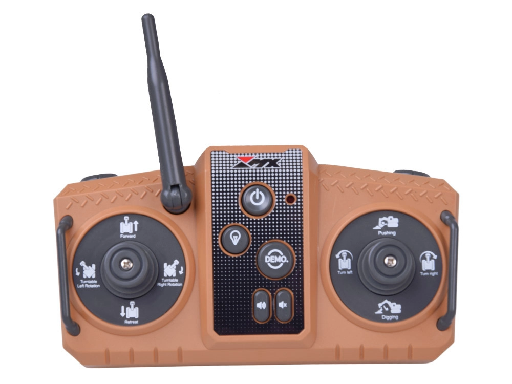 Il radiocomando a due joystick offre un controllo preciso dei cingoli, della rotazione della cabina e dei movimenti del braccio. La funzione DEMO mostra tutto con un solo tocco.