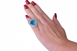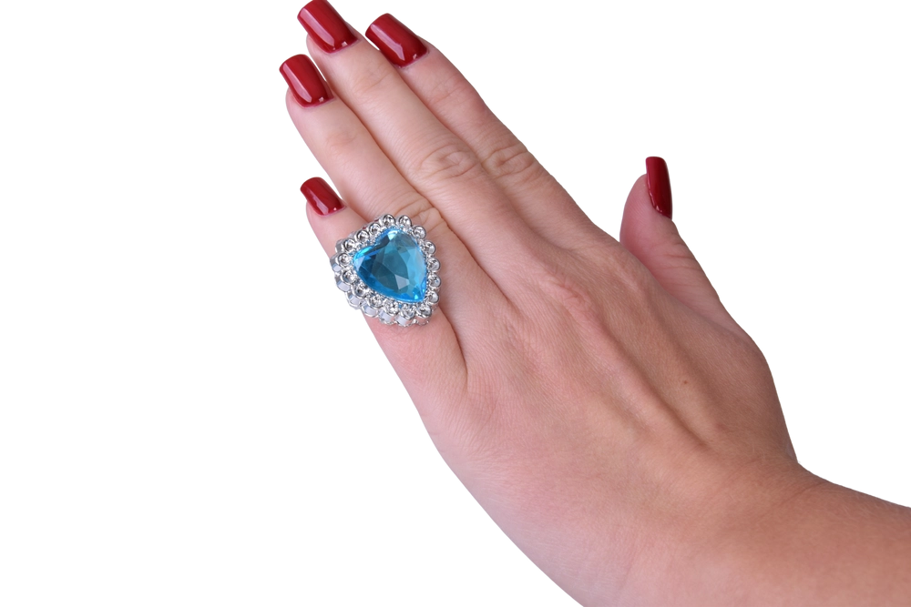 Orecchini clip e anello vistoso con pietre blu a forma di cuore completano splendidamente l’intero set e sono facili da mettere e togliere.