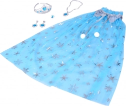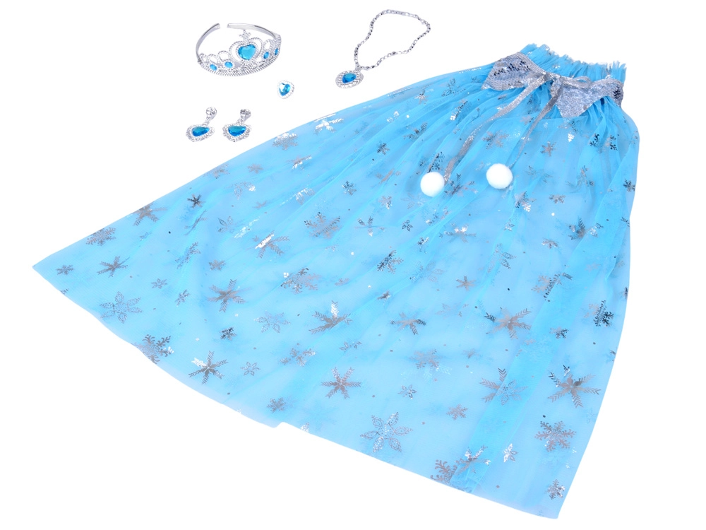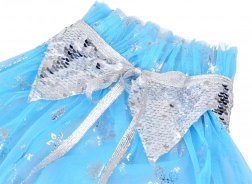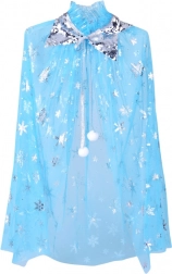 Elegante mantellina in tulle leggero e trasparente decorata con fiocchi di neve argentati e colletto con paillettes. Chiusura con morbidi pon pon bianchi per un indosso comodo e sicuro. Le tonalità di blu freddo con bagliori d’argento creano un incantevole look invernale amato dai bambini.