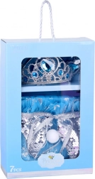 Il set comprende una gamma completa di gioielli: corona in plastica con “gemme” blu, collana con pendente a goccia, anello vistoso e orecchini clip con pietre a cuore. Tutto è leggero, confortevole e pensato per il travestimento dei bambini.